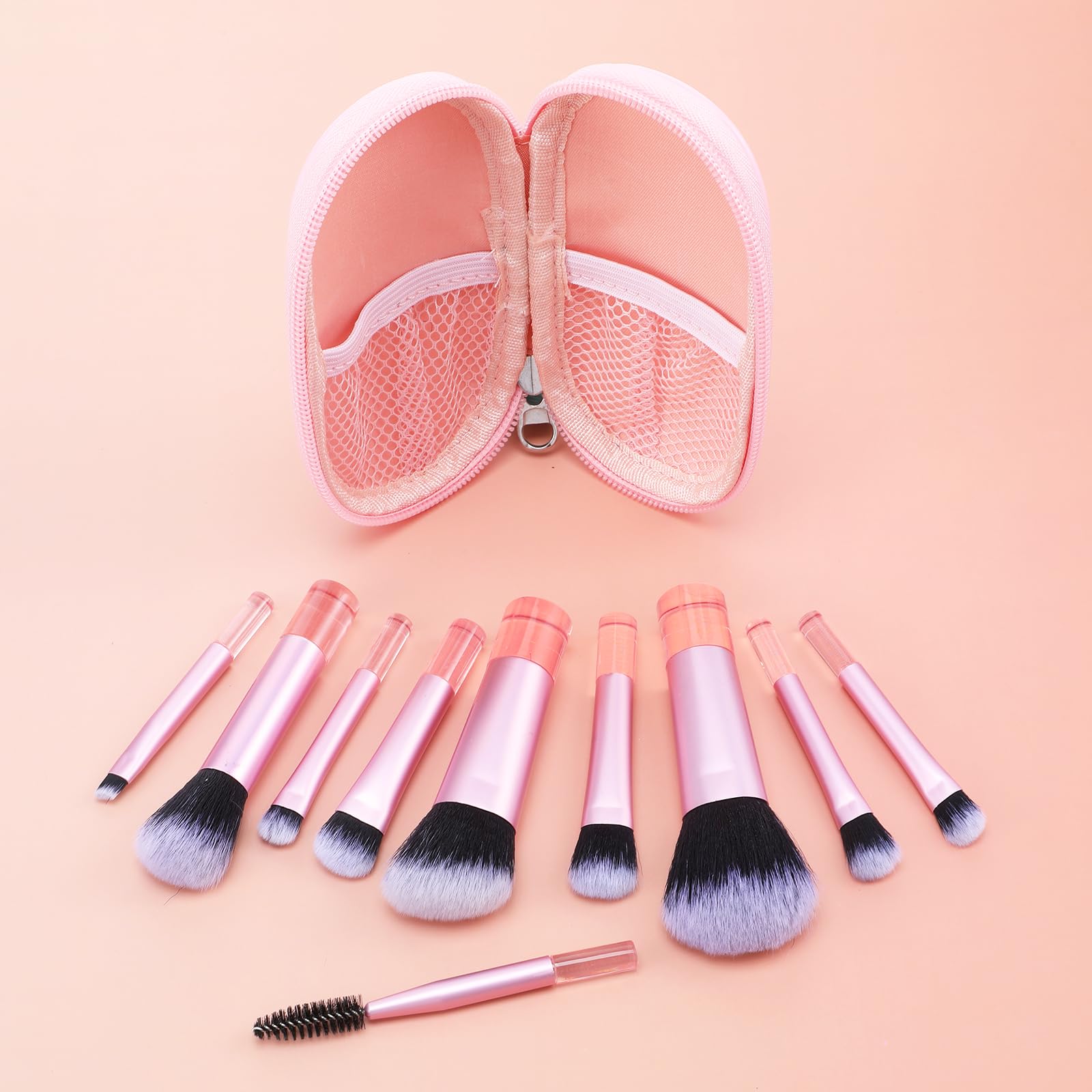 10 Pcs Easy-Taken Travel Makeup Brushes Mini Makeup Brush Set Portable Travel Brush Set with Pack Suitable for Foundation Eye Shadow Lipstick Concealer Highlighting Shadow Contour Blush (Pink)