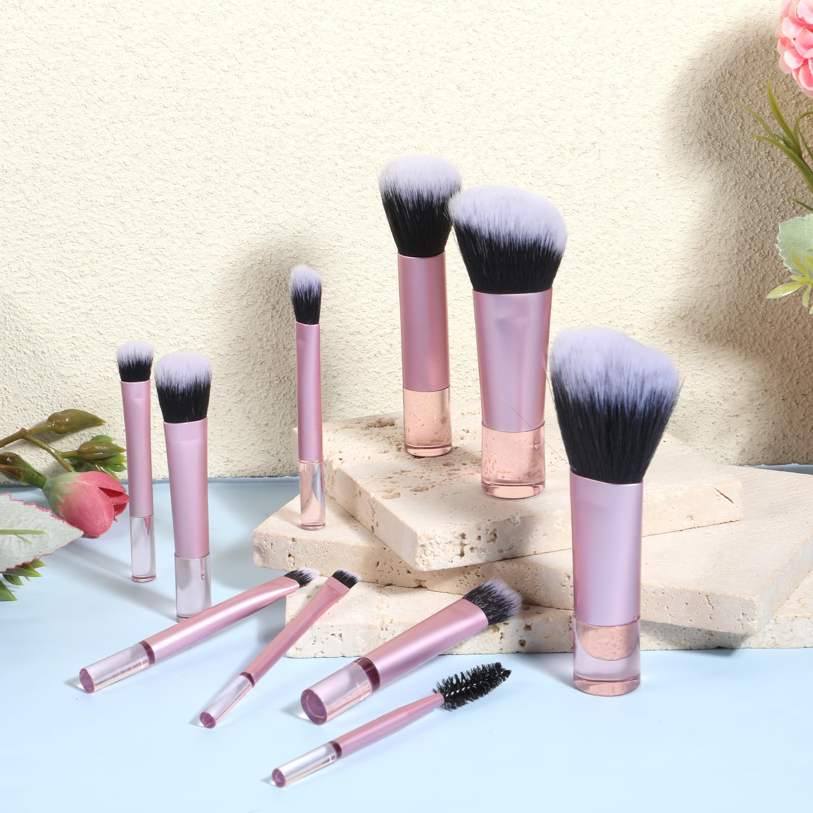 10 Pcs Mini Travel Makeup Brush Set With Pouch Pink Portable Travel Size Makeup Brushes Professional Cosmetic Brush Travel Essentials kits for Women Girls Brush Blush Powder Eye Shadow