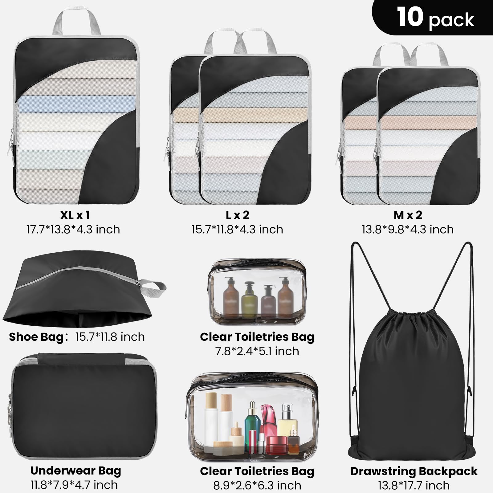 - What Will You Get: 10 set compression packing cubes for travel include 1 extra large cube cubes (17.7''x13.8''x4.3''), 2 large cubes (15.7'x11.8''x4.3''), 2 medium cubes (13.8"x9.8"x4.3"), 1 shoe bag (15.7"x11.8"), 1 drawstring backpack (13.8"x17.7"), 1 underwear bag (15.7"x19.6x"4"), 1 large clear toiletries bag (8.9"x6.3"x2.6"), 1 medium clear toiletries bag (8.9"x6.3"x2.6"), storage bags of various sizes can be used to pack clothes, pants, socks, shoes, cosmetics, etc., say goodbye to messy luggage and wardrobes, and keep your clothes neat and tidy