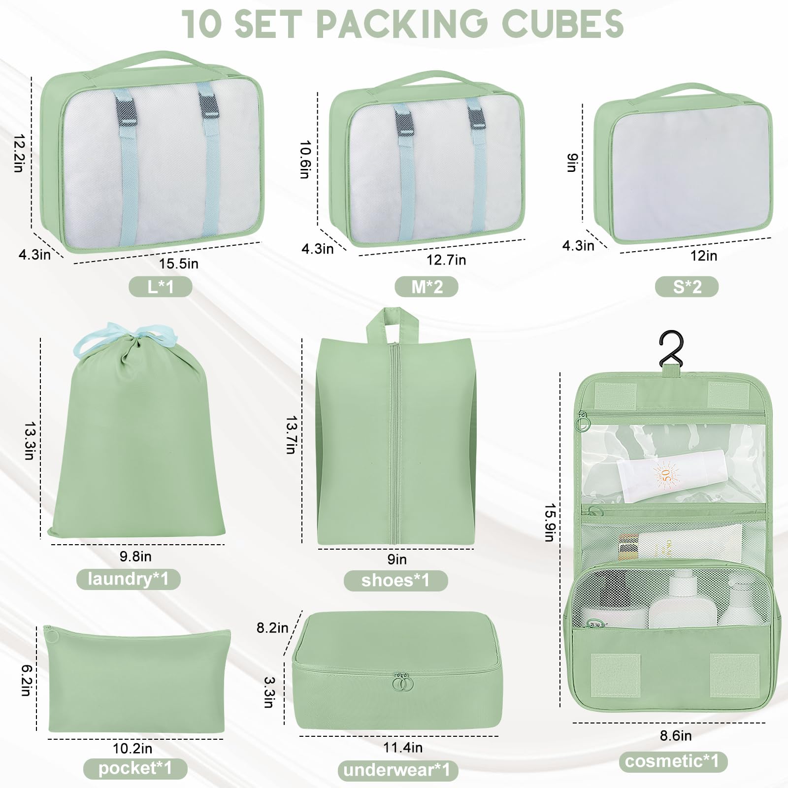 10 Set Packing Cubes for Travel, Travel Packing Cubes with Hanging Toiletry Bag and Shoe Bag, Suitcase Luggage Organizer Bags for Travel Essentials Women Men (Matcha)