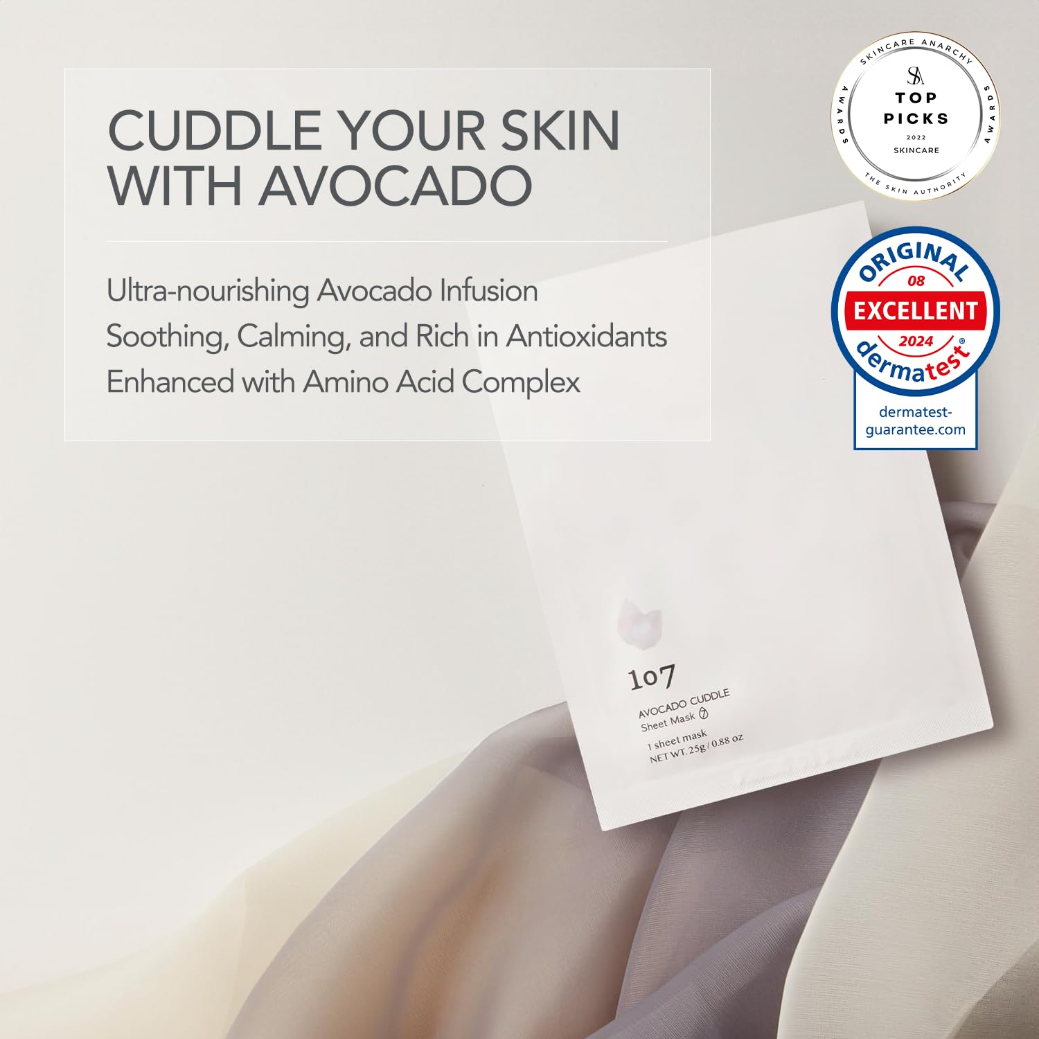 107 Avocado Face Mask, Pack of 5 Sheets, Infused with Avocado & Niacinamide, Nourishing & Moisturizing for Dry, Sensitive Skin, Korean Skincare, 0.88oz (25g) per Sheet