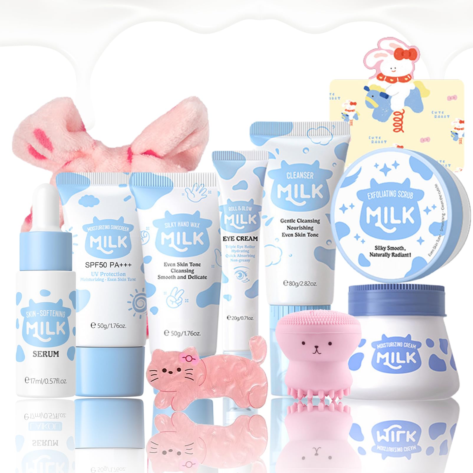 - 【Complete 11-Piece Milk Skincare Sets】: This all-in-one milk skin care sets & kits includes everything for a nourishing routine: milk cleanser, serum, face cream, eye cream, sunscreen, exfoliating scrub, hand wax, hair clips, headband, facial brush, and a greeting card. Perfect as a skincare set for teens or a kids skincare sets for girls 8-10, it delivers hydration and gentle care for smooth, radiant, healthy skin