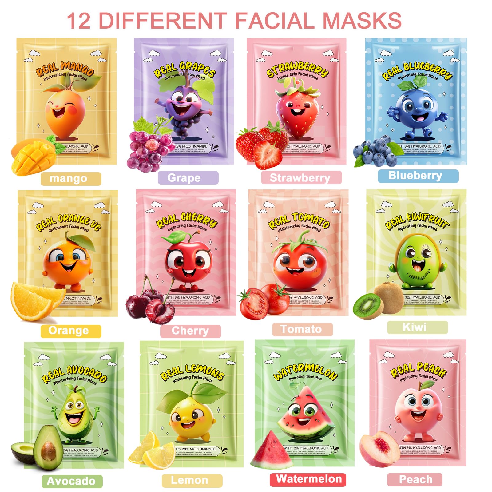 - 12 Sheet Fruit Mask: There are 12 different types of face masks in this set to help improve your skin condition, including mango, orange, grape, cherry, strawberry, kiwi, lemon, blueberry, avocado, tomato, watermelon, peach.