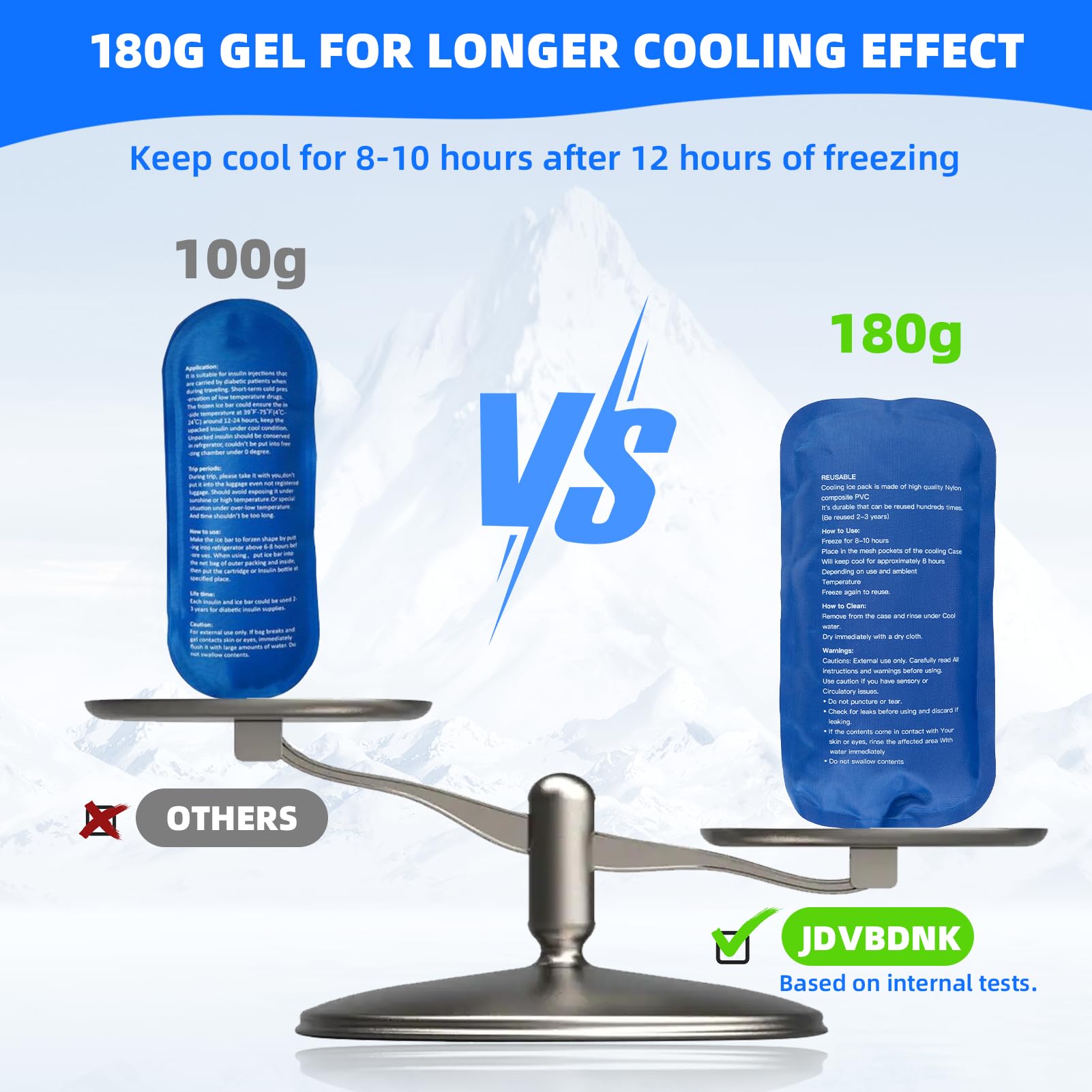 - Long-lasting Cooling Effect: The TSA Approved ice packs can be used to cool your medication cool last for 8-10 hours after 12 hours of freezing. the internal water content of the colloidal ice is 50%, which provides a longer-lasting cooling effect and keeps your insulin cooling case and other medications at the right temperature.(2x 180g ice packs)