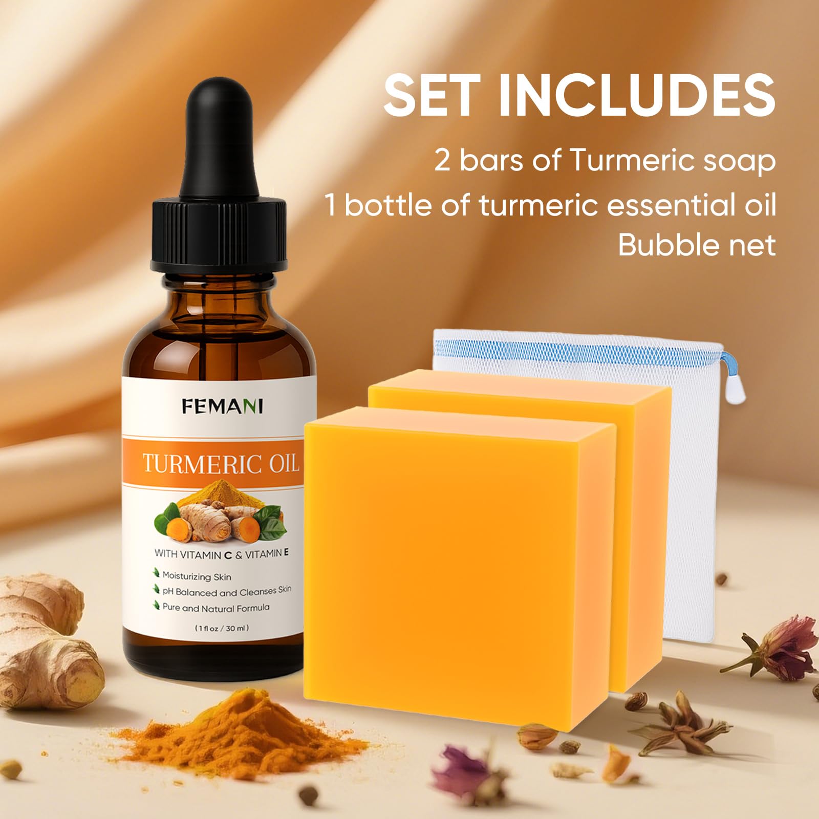 2 PCS Natural Turmeric Soap Bar for Face & Body Cleanser and Turmeric Oil, Nautral Ingredients Turmeric Wash and Care Set, Soothing, Hydrating, Turmeric Skin Care Set for All Skin Type