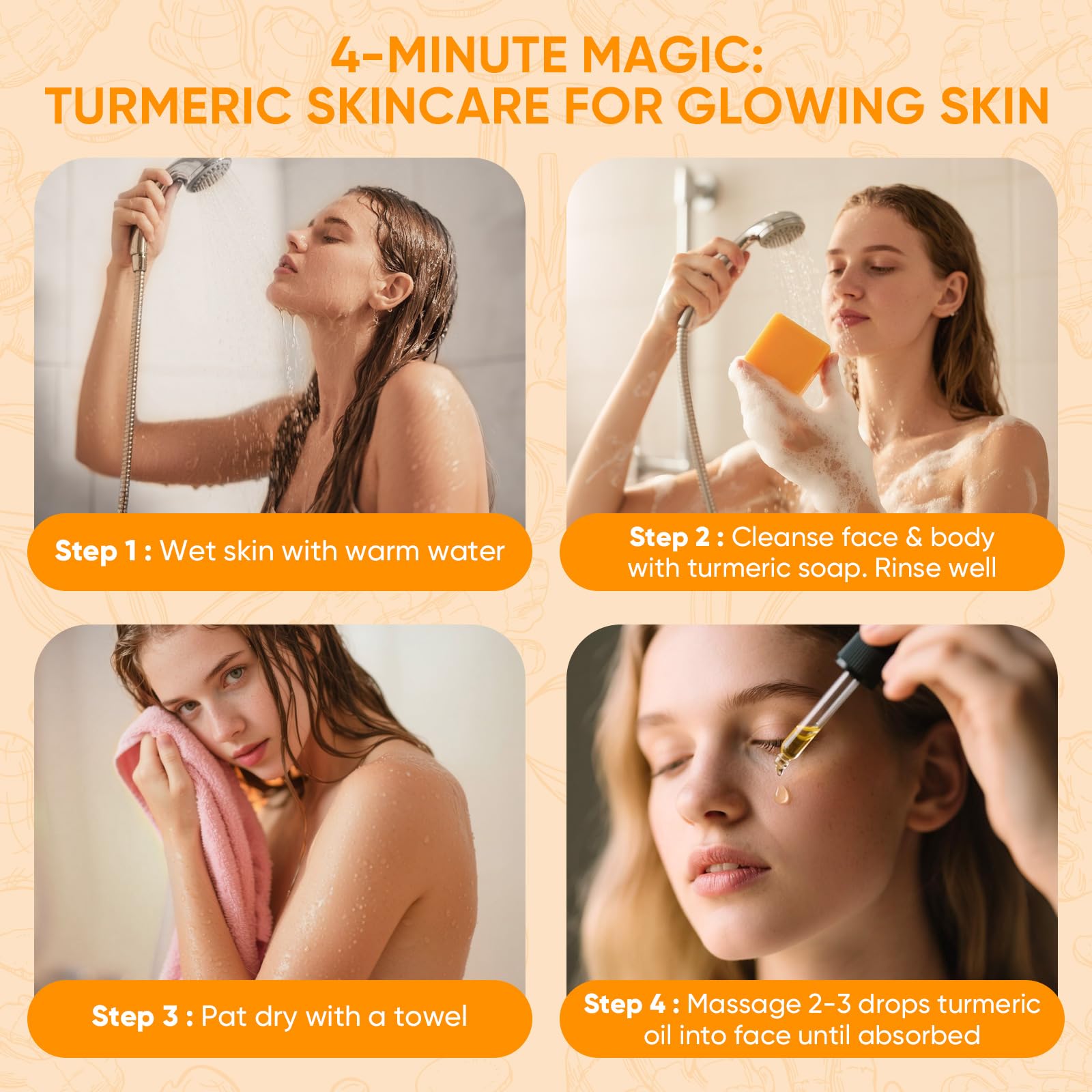 - 【SUITABLE FOR ALL SKIN TYPES】Gentle formula works effectively on all skin types, from dry to oily, making turmeric soap and turmeric oil perfect for the whole family. Suitable for both face and body cleansing, making it an ideal all-in-one solution for your daily skincare routine