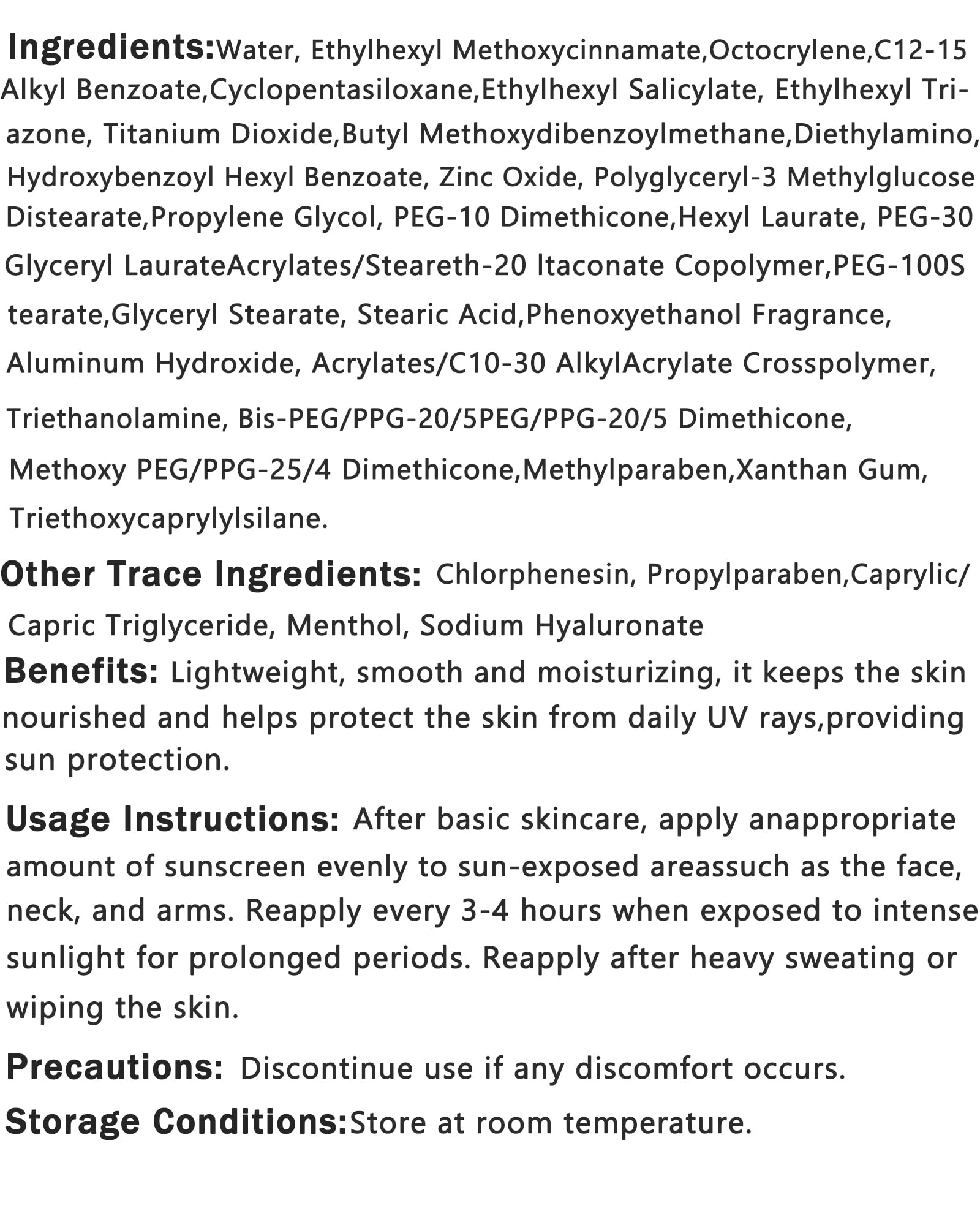 - High SPF50+++ Protection - Formulated with SPF 50+ PA+++, this sunscreen provides advanced sun protection, shielding your skin from harmful UV rays during various outdoor activities. It is non-greasy and quickly absorbed, providing powerful sun protection throughout the summer. Each use also nourishes your skin, allowing you to enjoy the summer sun to the fullest!