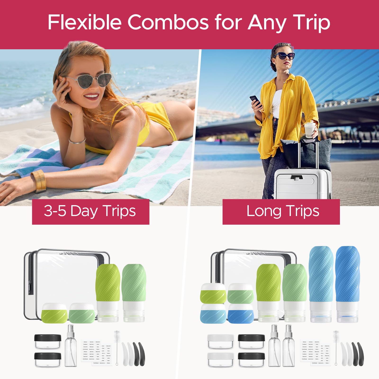 - Flexible Combos for Any Trip: Designed for both short getaways and long-haul adventures—no more carrying bulky full-size bottles. LitBear 23 pack travel bottles set includes 4 silicone travel bottles (3oz & 2oz), 4 travel containers for creams (1oz), 4 plastic jars (0.34oz), 2 fine mist spray bottles (1oz), 1 funnel, 1 brush, 4 spatulas, 2 labels, and 1 TSA approved travel bottles clear bag