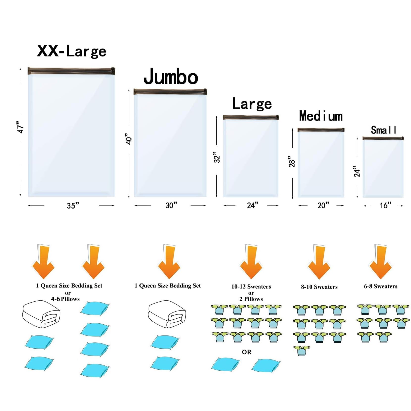 - [Comprehensive 24-Bag Variety] This versatile set includes 5 Jumbo, 5 Large, 5 Medium, 5 Small, and 4 Travel roll up bags, covering all your storage needs. Whether it’s for blanket storage or securing seasonal attire, our assortment ensures everything from bulky outerwear to delicate garments is protected and organized, proving indispensable for both home use and as travel vacuum bags with pump.