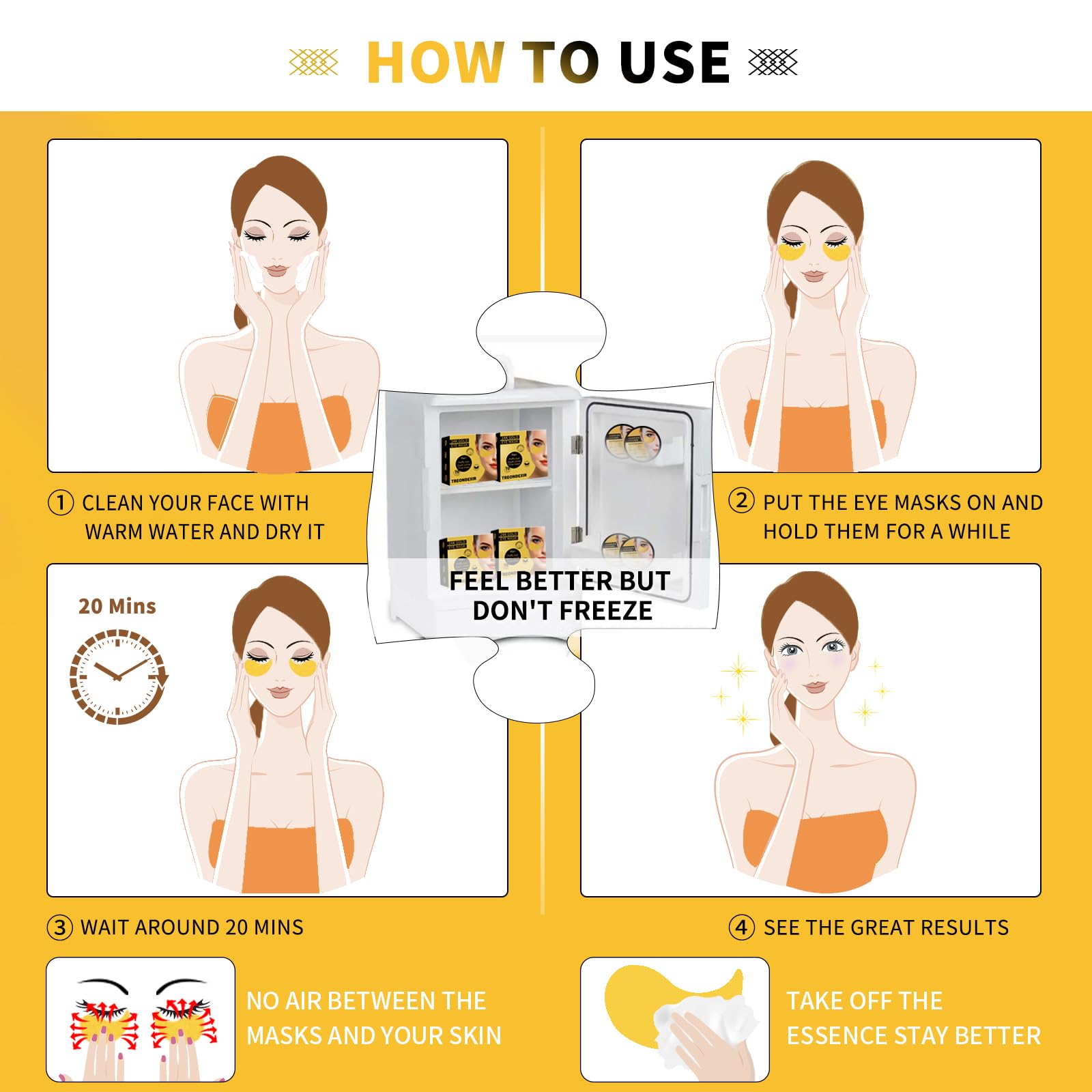 - How to Use: Begin by cleansing and drying your face. Then, gently remove excess serum from the eye gel masks and press them onto your face for several seconds. Allow around 20 minutes for your skin to absorb the premium ingredients. Remove the under eye patches and massage your skin for enhanced absorption—no need to rinse. Thanks to its professional design, our eye mask for puffiness can adhere perfectly to your skin, providing an effective solution for puffy eyes and dark circles treatment.