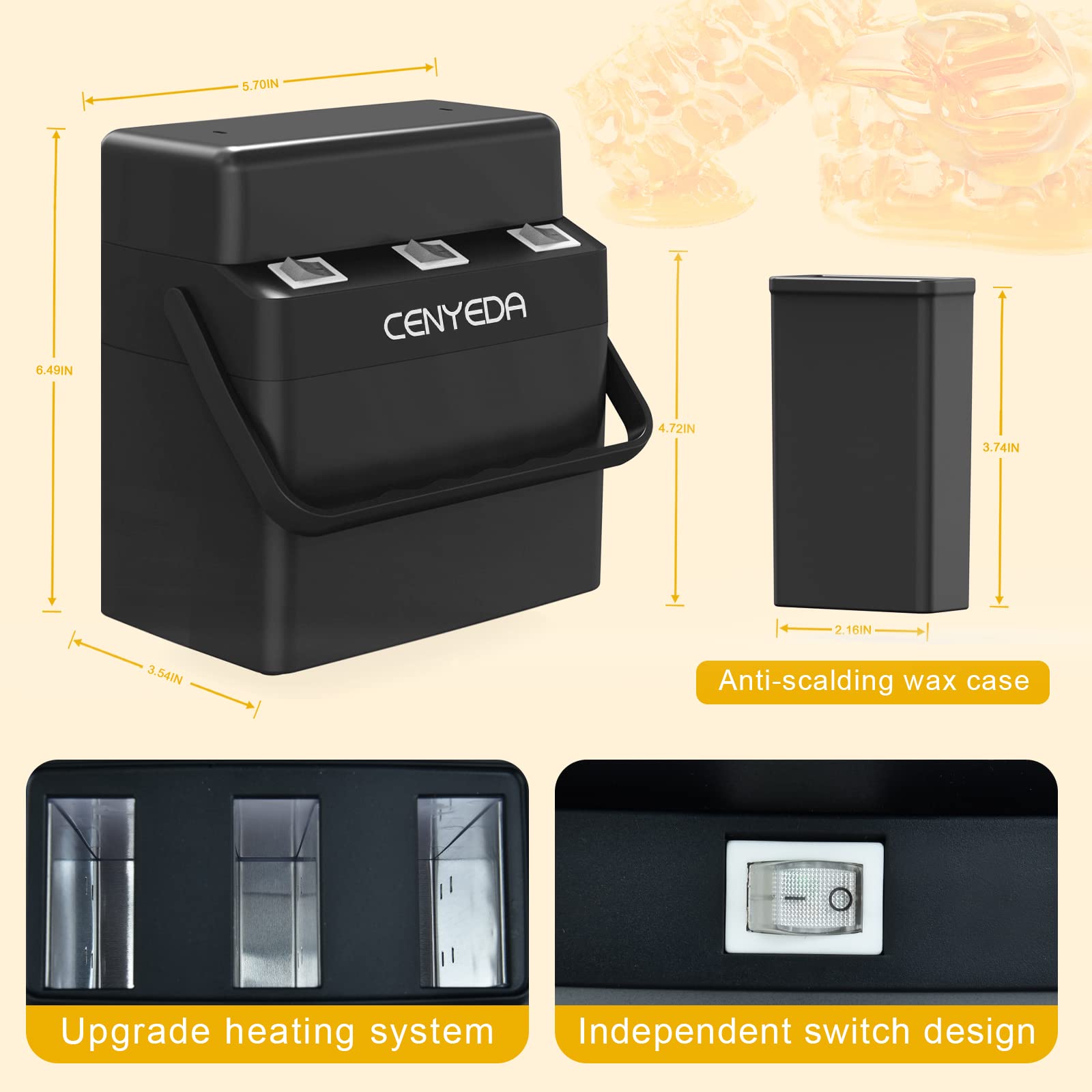 - ✅【Roll-on Hair Removal Kit】: 1x Triple depilatory Wax Warmer;3x Honey wax cartridge;20x After-wax Treatment olive bag;100 x wax paple strip.For whatever reason, If you are not satisfied with our waxing kit,Please contact us, CENYEDA offers 12 months exchange or return and money-back guarantee.
