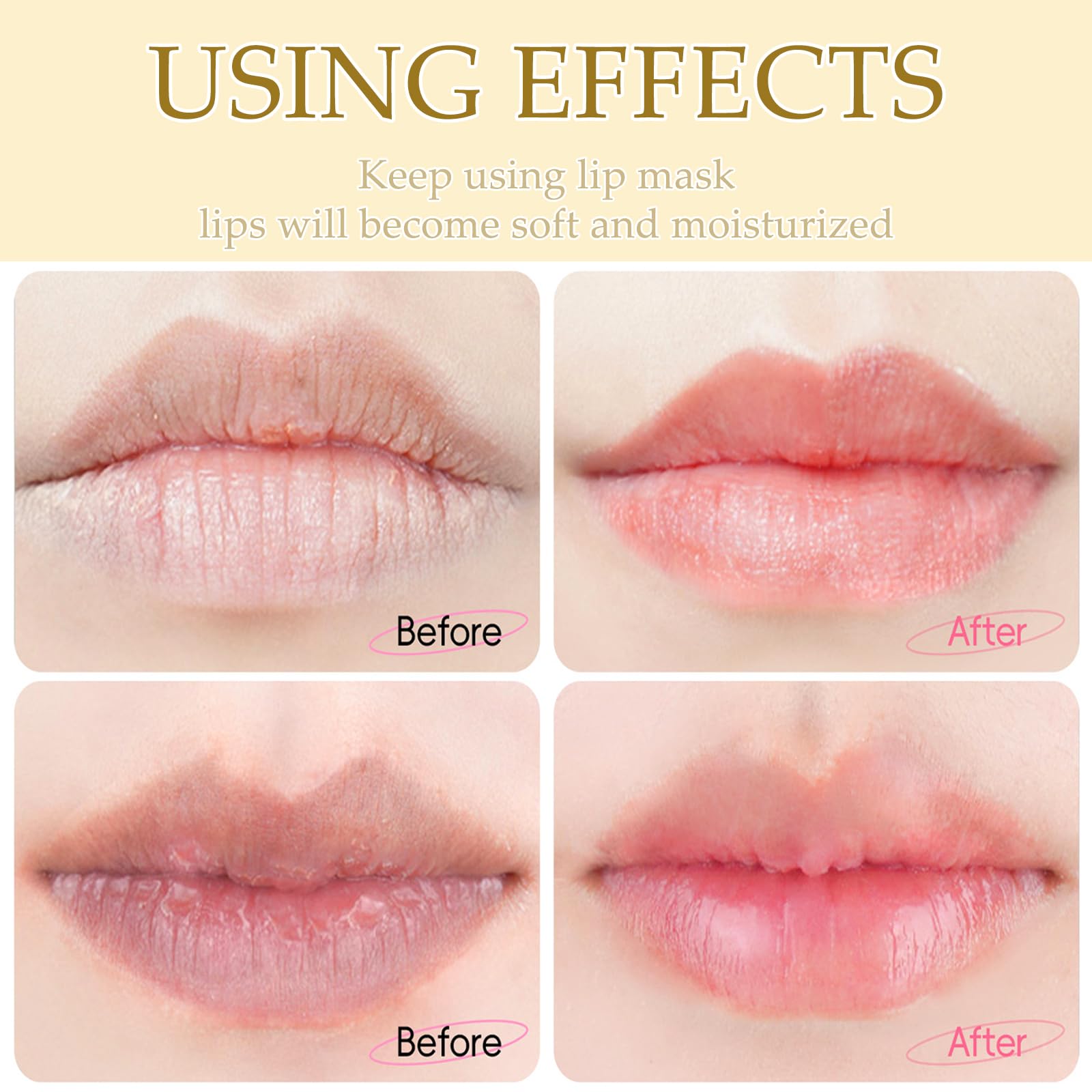 - Tip:When applying the eye masks bulk, make sure to hold it tightly to your lips to avoid creating air between your skin and the mask. Our lip masks are rich in extracts, so they may be a little slippery at first. In order to improve adhesion, during the first use, you can lie down for about 2 minutes to make the lip mask or eye mask fit the skin film, after fitting, you can move freely, but you should avoid strenuous exercise during the use.