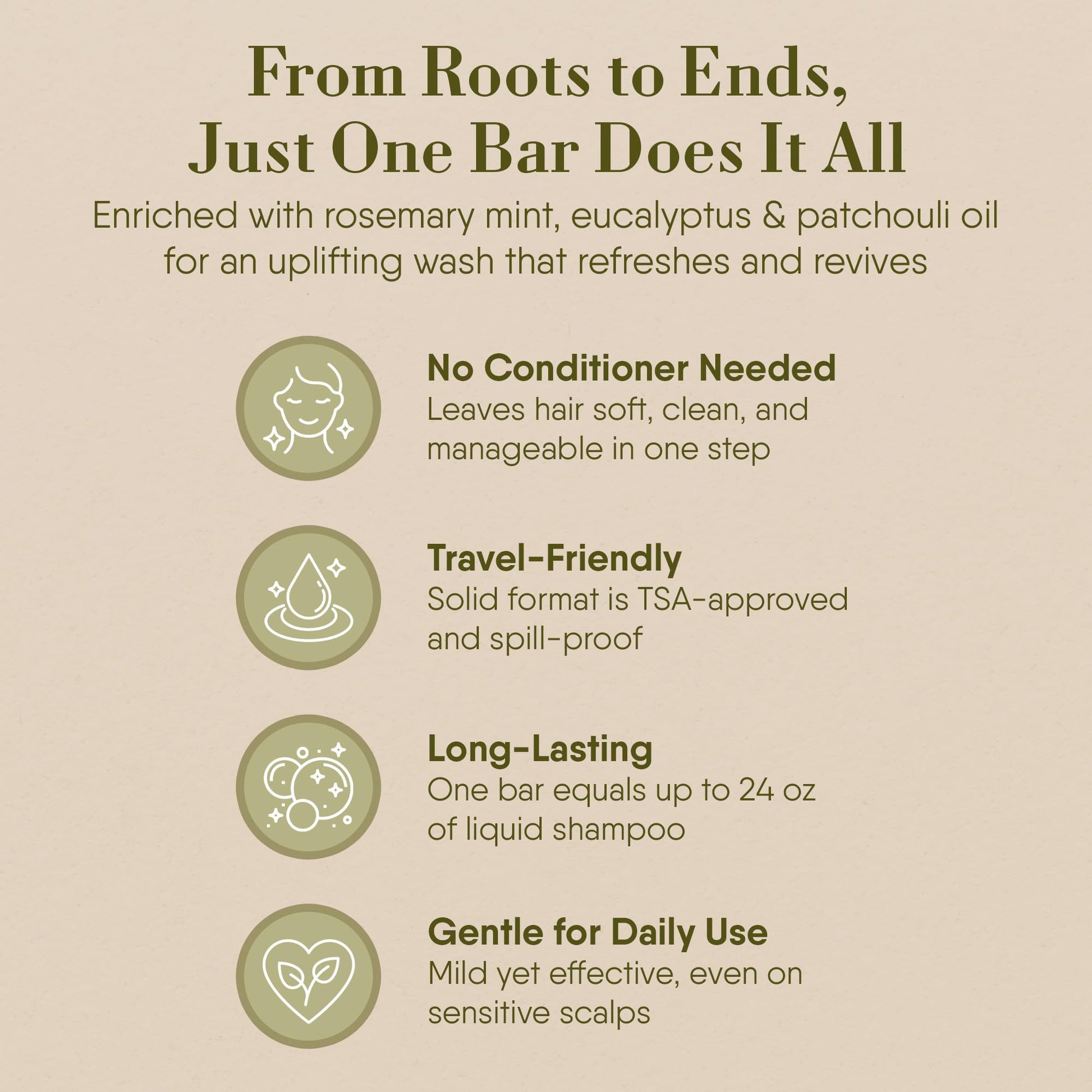 - Scalp Soothing: Struggling with a flaky scalp? The powerful combination of Tea Tree, Eucalyptus, and Rosemary Mint Oils in this natural shampoo bar combats dandruff, controls excess oil, and relieves scalp irritation for a clean, healthy scalp.