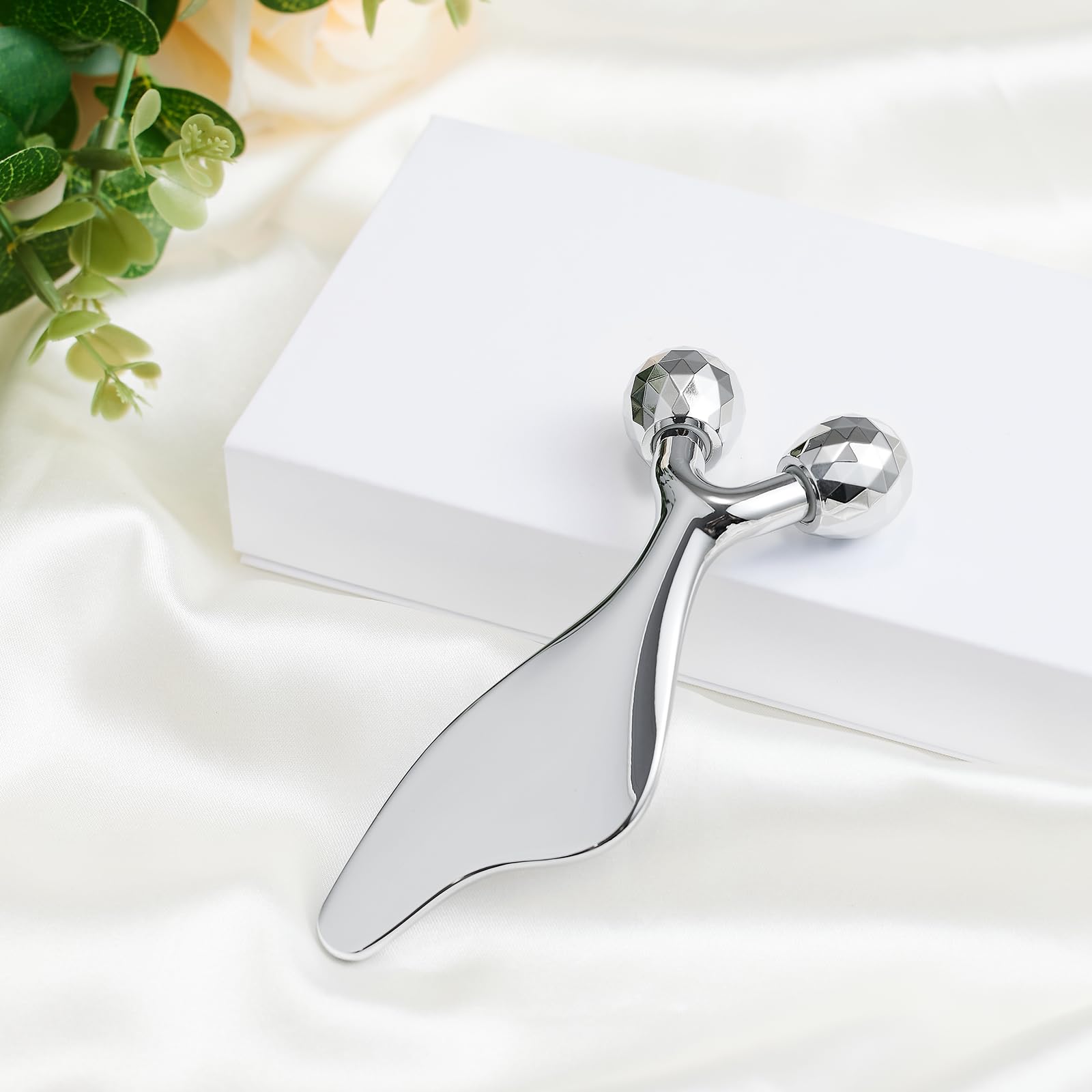 - 2-in-1 Facial Massager & Gua Sha Tool: This versatile face massager combines a 360° rotatable 3D roller and a smooth Gua Sha tool for a complete skincare routine. The Y-shaped design ensures close contact with your skin, promoting elasticity and a youthful glow.