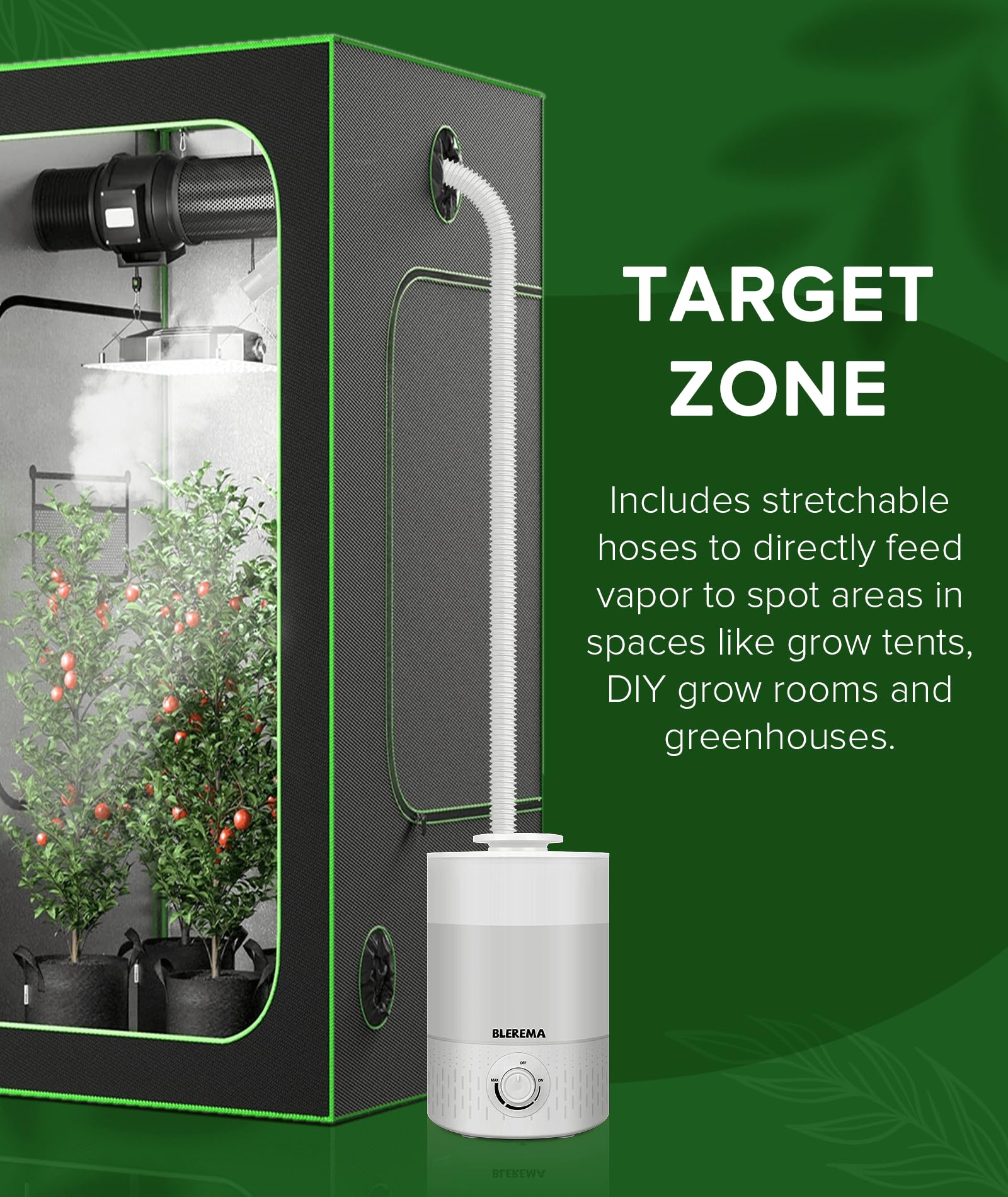 - 【Humidifier for Grow Tent】 BLEREMA's compact, ultrasonic, cool mist humidifying fogger is specifically designed for grow tents, grow rooms, and greenhouses. The water droplets are broken up into tiny floating particles of about 5μm by high-frequency resonance of ultrasonic waves. Keep a humid environment for your plant rather than a wet environment.