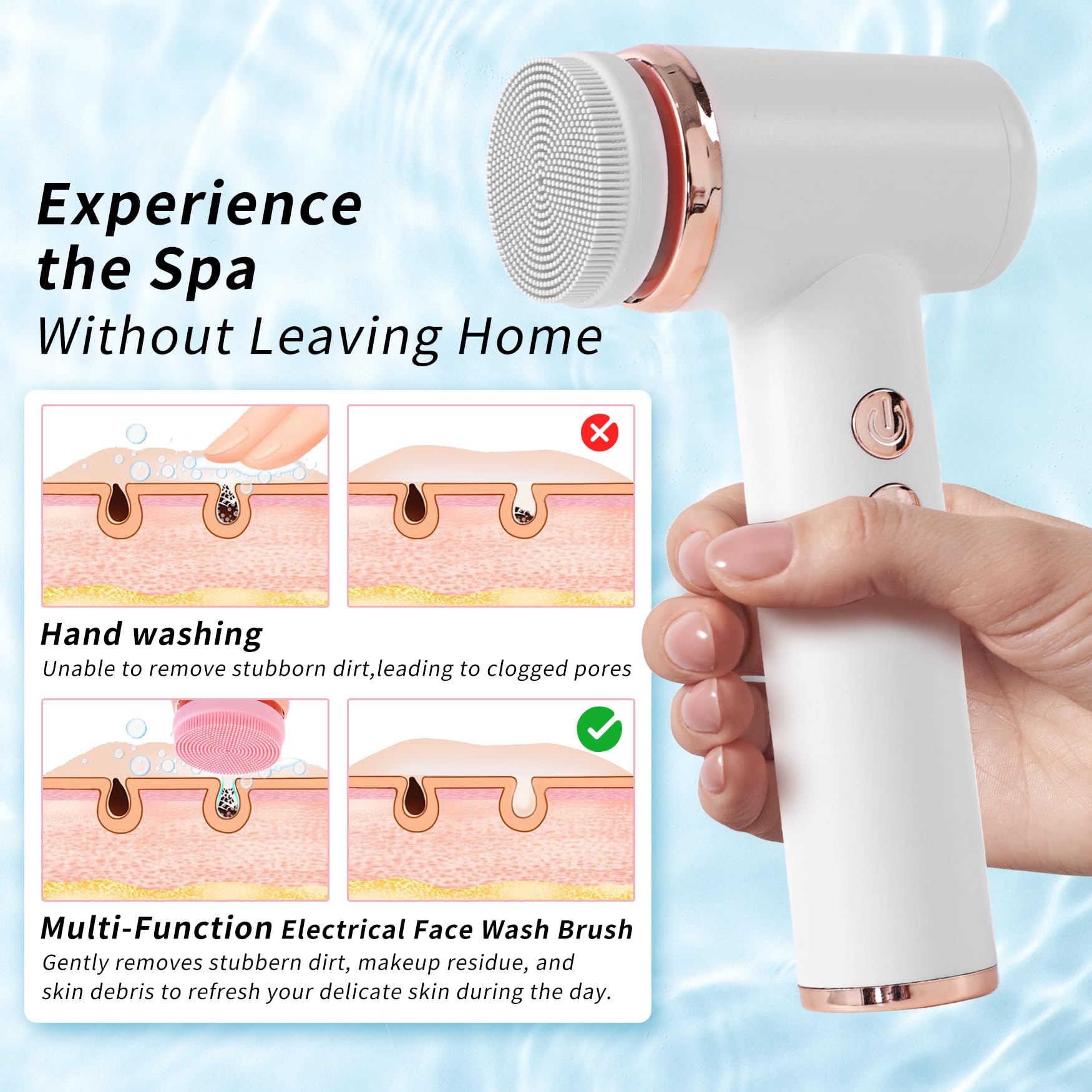 - 【Experience the Spa Without Leaving Home】With 4 removable, multi-functional brushes including an exfoliating brush, silicone brush, pore cleansing brush, and steel bead brush, this power cleansing brush allows you to customize your personal cleansing routine at home, gently removing stubborn dirt, makeup residue, and skin debris to leave your delicate skin refreshed and revitalized during the day and refreshed and relaxed at night.