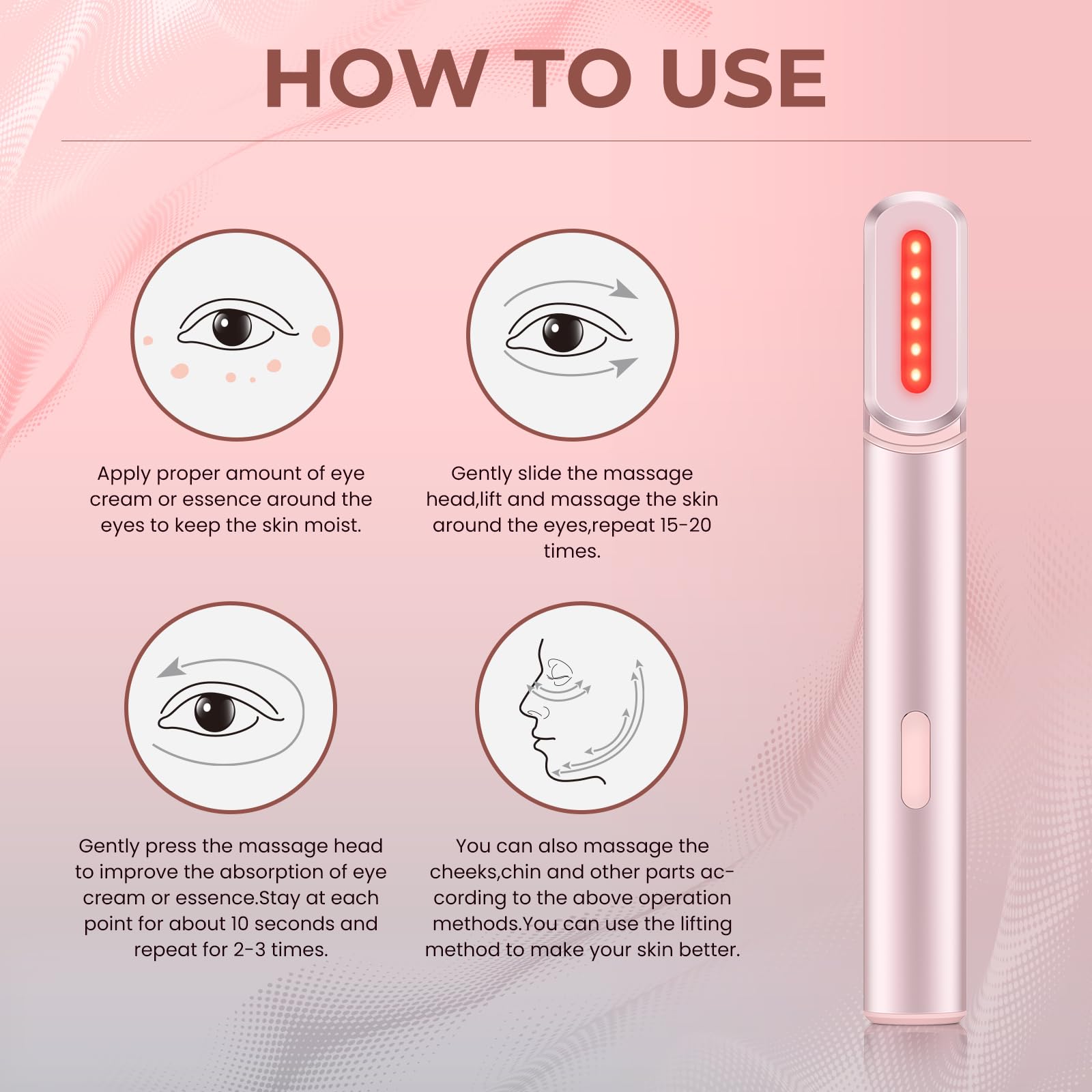 - 【Safe & Comfortable】The LED eye beauty wand is safe, comfortable and eco-friendly, made with quality materials and the latest light irradiation technology.Suitable for all skin types.As little as 3 minutes per day,3 times per week,helps reduce the appearance of:Fine Lines/Blemishes/Puffiness/Dark Circles.