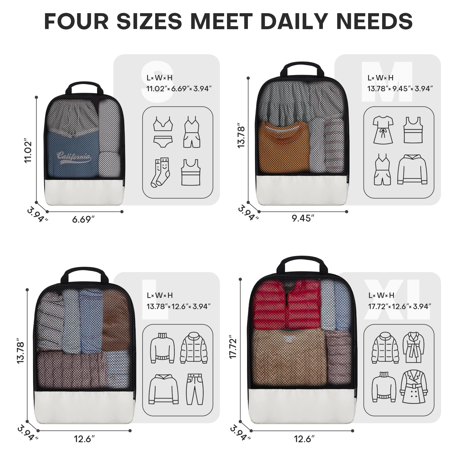 - Versatile & Flexible: Our packing organizer features 4 different sizes organizers for different items: L-M-S-XS for essentials like jackets, shirts, spants, underwear, toiletries, and more. Laundry bag keeps soiled clothing separate.
