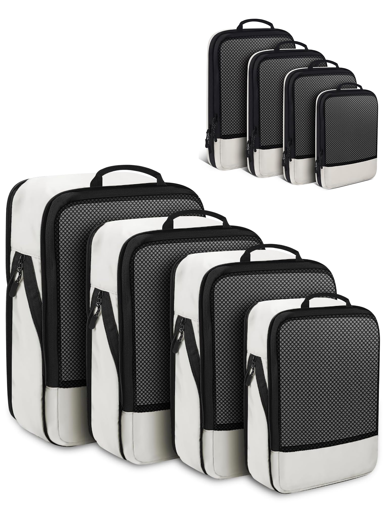 4 PCS Set Compression Packing Cubes for Travel, Lightweight Packaging Organizer Bags for Carry On Space Saving, Travel Essentials Cubes for Suitcase Backpack, Beige