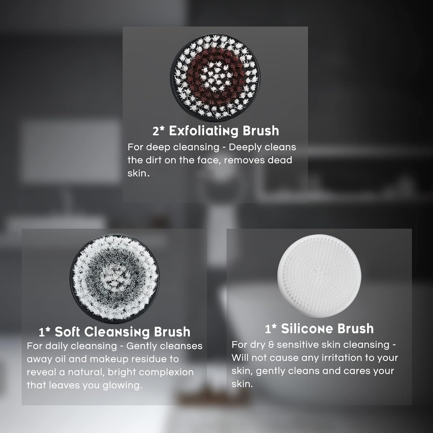 - COMPREHENSIVE 3 IN 1 FACIAL CLEANSING SYSTEM - 4 brush heads include 2 exfoliating brush heads, a soft cleansing brush head and a silicone brush head. Suitable for all skin types and meet all your facial cleansing needs.