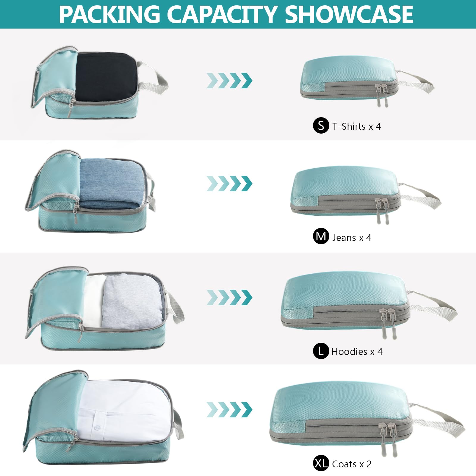 - 【4 Sizes for Every Packing Need】: Meet all packing needs with this 4 Set Compression Packing Cubes for Travel: XL (16"×12"×4") holds 2 coats, L (14"×10.5"×4") fits 3-4 sweaters, M (13"×9"×4") stores 4 jeans, and S (10"×8"×3.5") organizes 4 shirts + underwear—maximizing luggage space like no other Packing Cubes