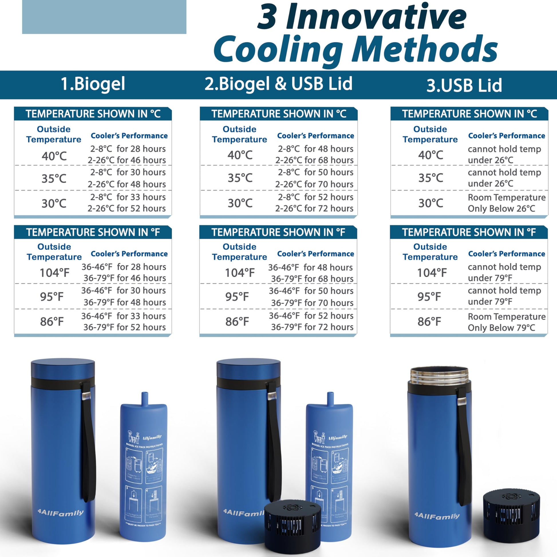 - MULTIFUNCTIONAL COOLER WITH USB CHARGER – By switching the lid, you can transform this insulin cooler travel case USB-built in, into a portable fridge, reducing internal temperatures by 15-25°F lower than outside temperature without ice packs. Its built-in USB charging port allows you to stay powered on the go by using 4allfamily powerbank. Best performance is achieved when biogel is used in combination with the usb charger.