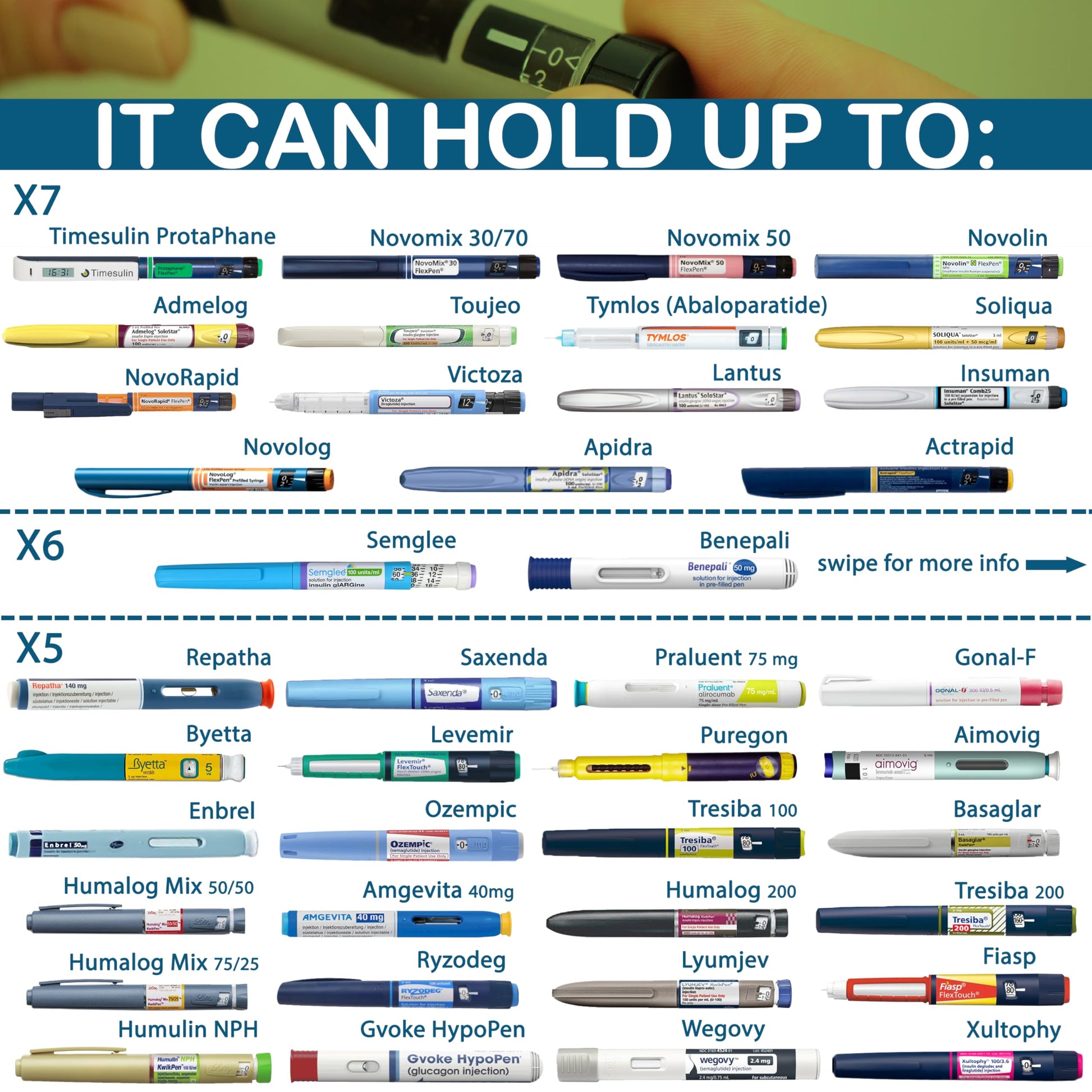 - LARGE CAPACITY STORAGE: With enough space to hold up to 7 insulin pens or other medications, this medicine travel cooler ensures that you have ample storage for longer trips. Whether on a simple city trip or in extreme climates, this diabetic case keeps medicine cool while travelling. 🛑 PLEASE CAREFULLY CHECK IMAGES TO MAKE SURE THE MEDICATION YOU ARE USING IS INCLUDED IN THE LISTING. 🛑 IF THE MEDICATION YOU ARE USING IS NOT IN THE LISTING, PLEASE REFER TO THE FREE SPACE TO DETERMINE CAPACITY OR KINDLY ASK SUPPORT TEAM.