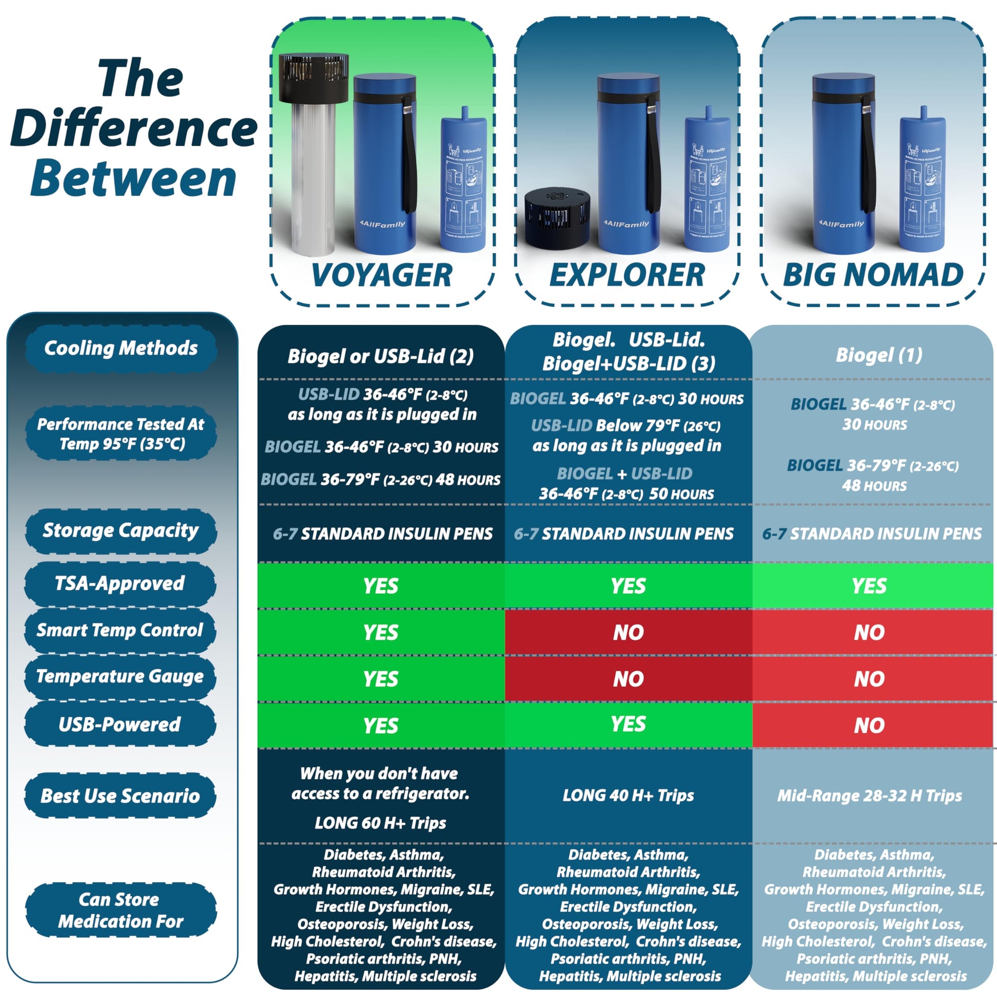 4ALLFAMILY Voyager Auto Shut Off Cooler Travel Case TSA Approved (1–7 Medication Pens) – On–The–Go Medical Cooler with Biogel & USB Charger – Diabetes Travel Case for Insulin & EpiPens (Blue)