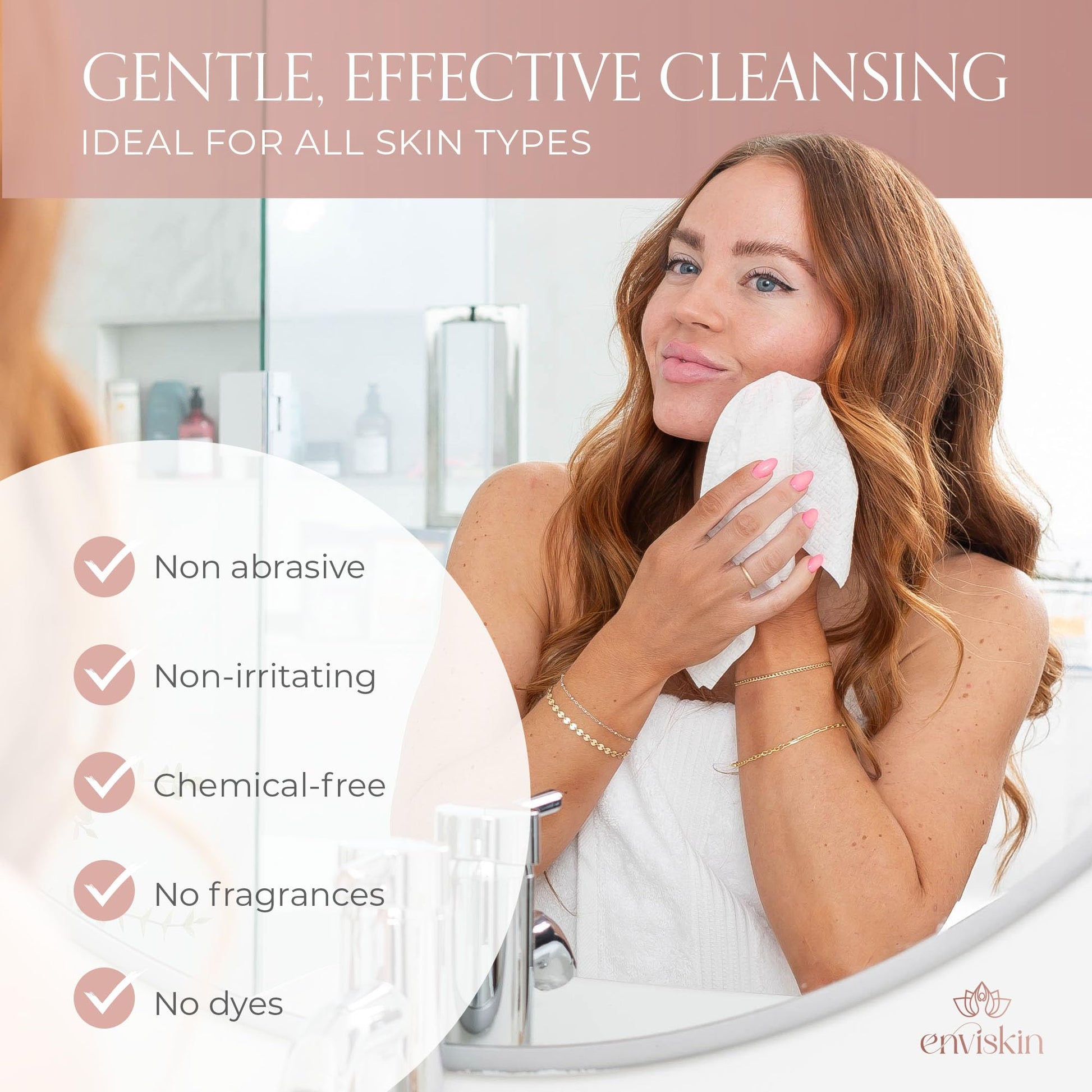 - Ultra Absorbent & Durable - Don’t let the softness fool you. Enviskin facial wipes are built tough for even the most intense skincare regimens. With an extra large 10”x12” of surface area, you’ll soak up excess oil, makeup and dirt—all without tearing, shedding or falling apart mid-cleanse.