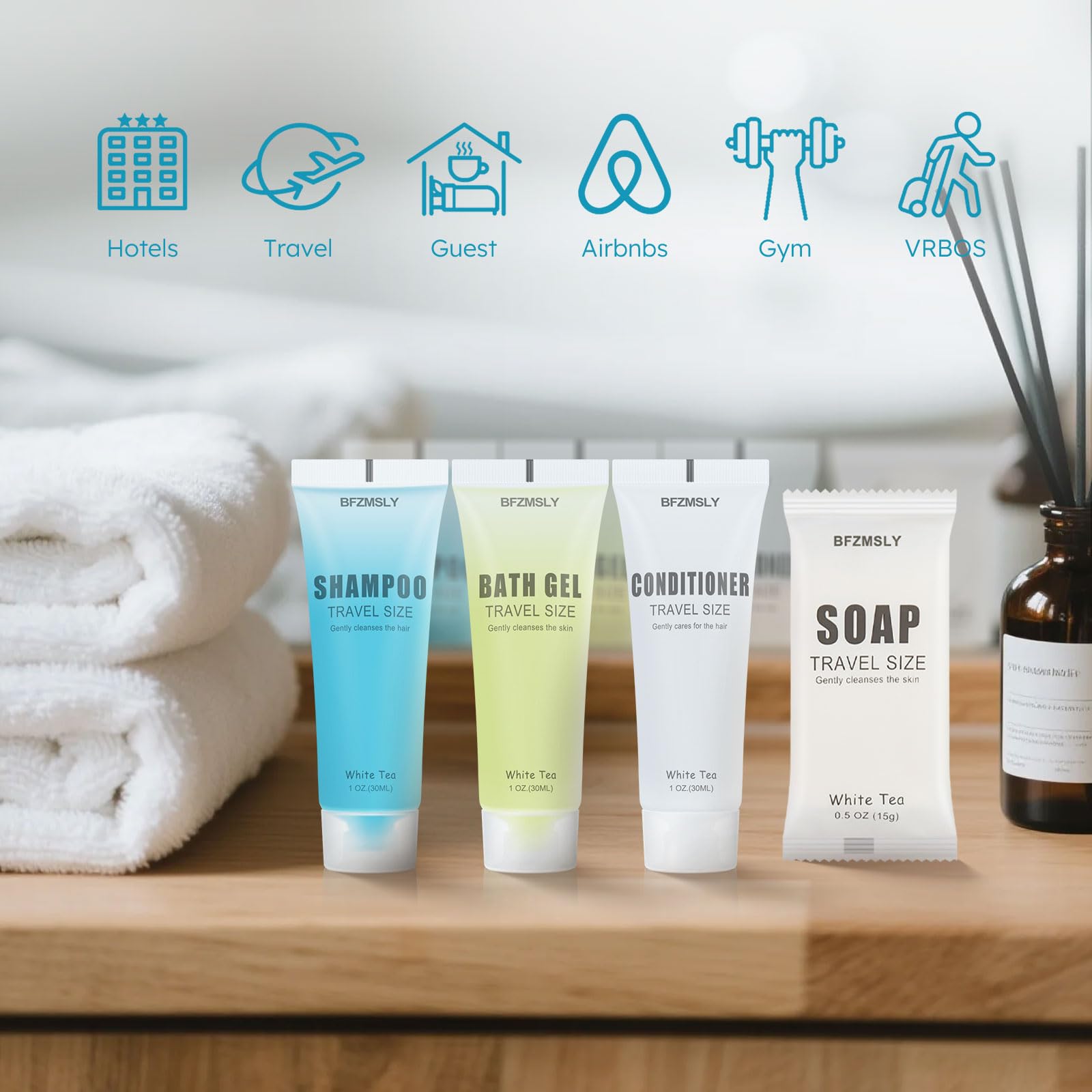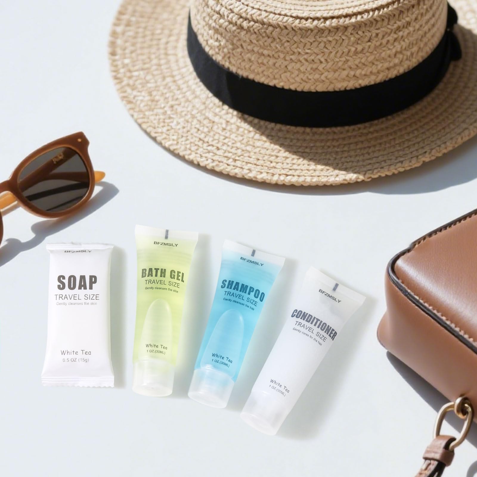 50 Sets Hotel Toiletries Set Bulk, 200 Pcs Travel Mini Bundle Amenities with Shampoo, Conditioner, Body Lotion & Bar Soap - White Tea Scent - Guest Supplies for Airbnb, Motel, Hospitality