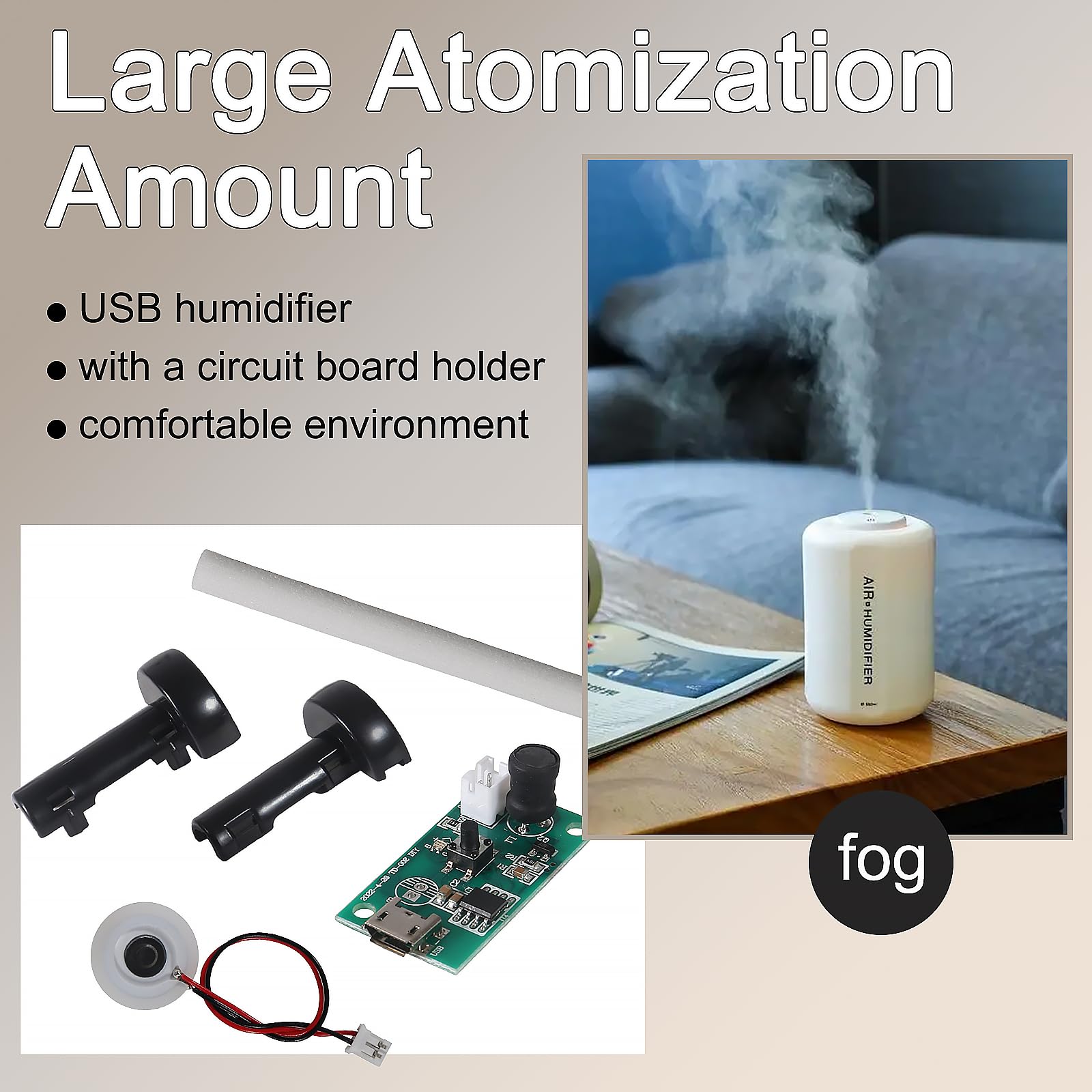 - Application: Ultrasonic mist maker is a humidifier DIY kit, which is widely used in atomization equipment such as USB humidifier, perfume atomizer, aromatherapy atomizer, etc.