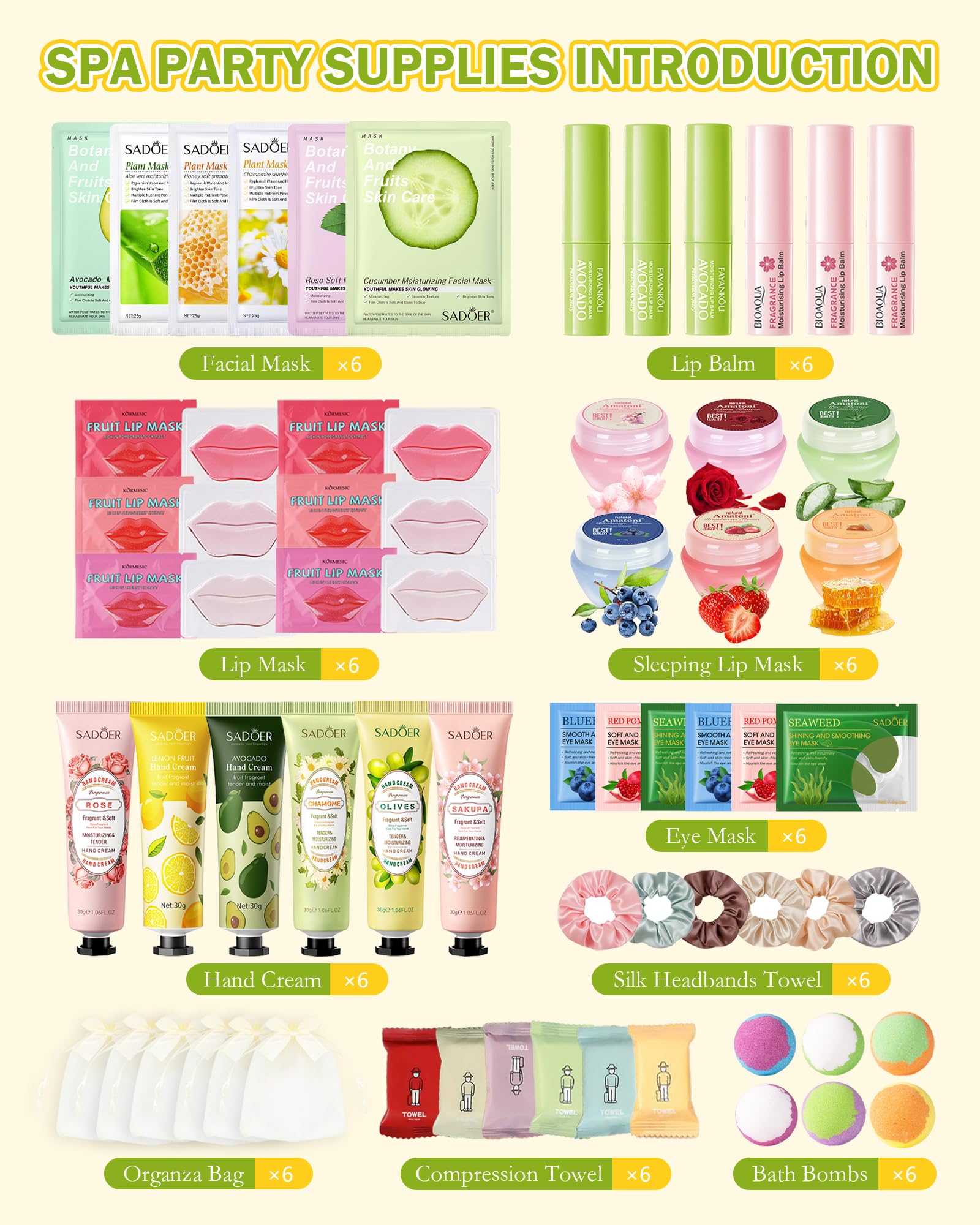 - Spa Party Supplies Set For Women - This 60-piece spa set includes 6 hand creams, 6 lip balms, 6 face masks, 6 overnight lip masks, 6 eye and lip mask combos, 6 bubble bath balls, 6 compressed towels, and 6 hair ties. Six exclusive sets cater to the spa needs of six people. Each set comes with a gift bag for easy storage. As the perfect spa gift set for women, it allows you to enjoy professional spa treatments anytime, anywhere—whether at home, while traveling, or at a party.