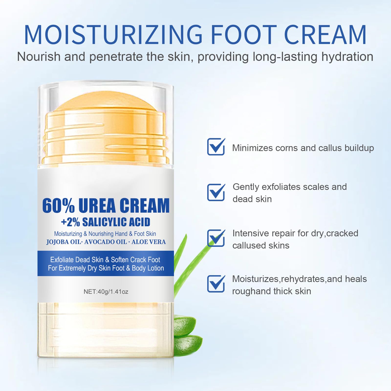 - DEEP HYDRATION & CRACKED SKIN REPAIR: Our intensive 60% urea foot cream delivers deep moisturization, targeting dryness, cracks, and rough skin. Enriched with glycerin, hyaluronic acid, and natural emollients, it penetrates deeply to heal and restore softness, leaving your feet smooth and nourished.