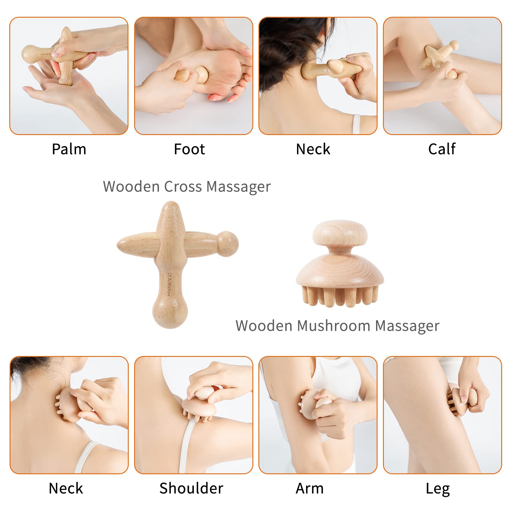 - 【7 In 1 Wood Therapy Massage Tools Kit】Airelax's maderoterapia kit includes 1*Wooden Muscle Massage Roller Stick,1*Wooden Cube Muscle Massage Roller Stick,1*Wooden Massage Cup,1*Wooden Body Gua Sha Tool,1*Wooden Back Massage Roller Rope,1*Wooden Mushroom Massager,1*Wooden Cross Massager,1*User Manual,1*Cotton Drawstring Travel Bag.