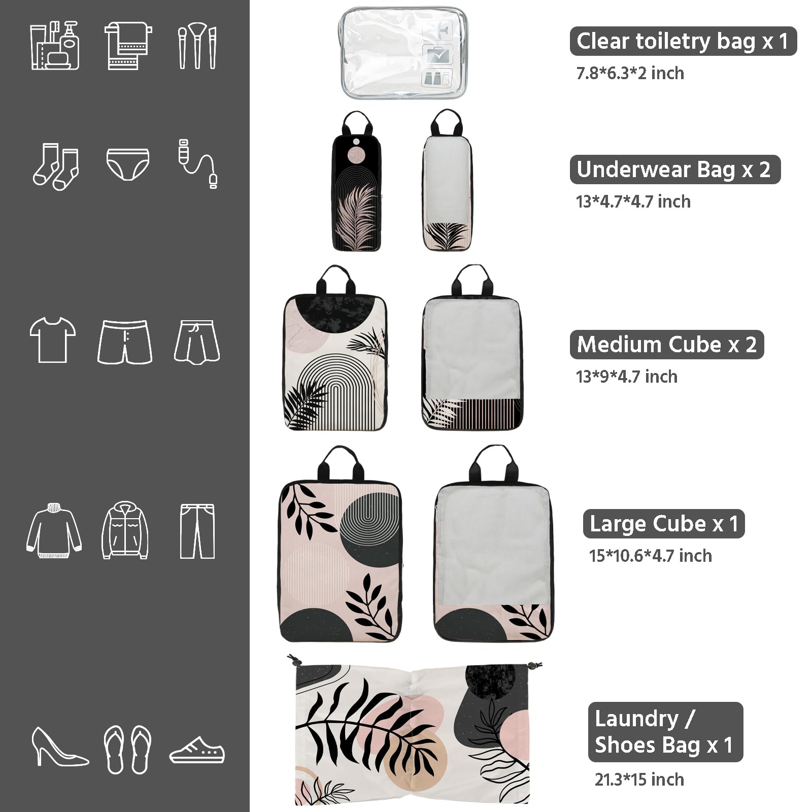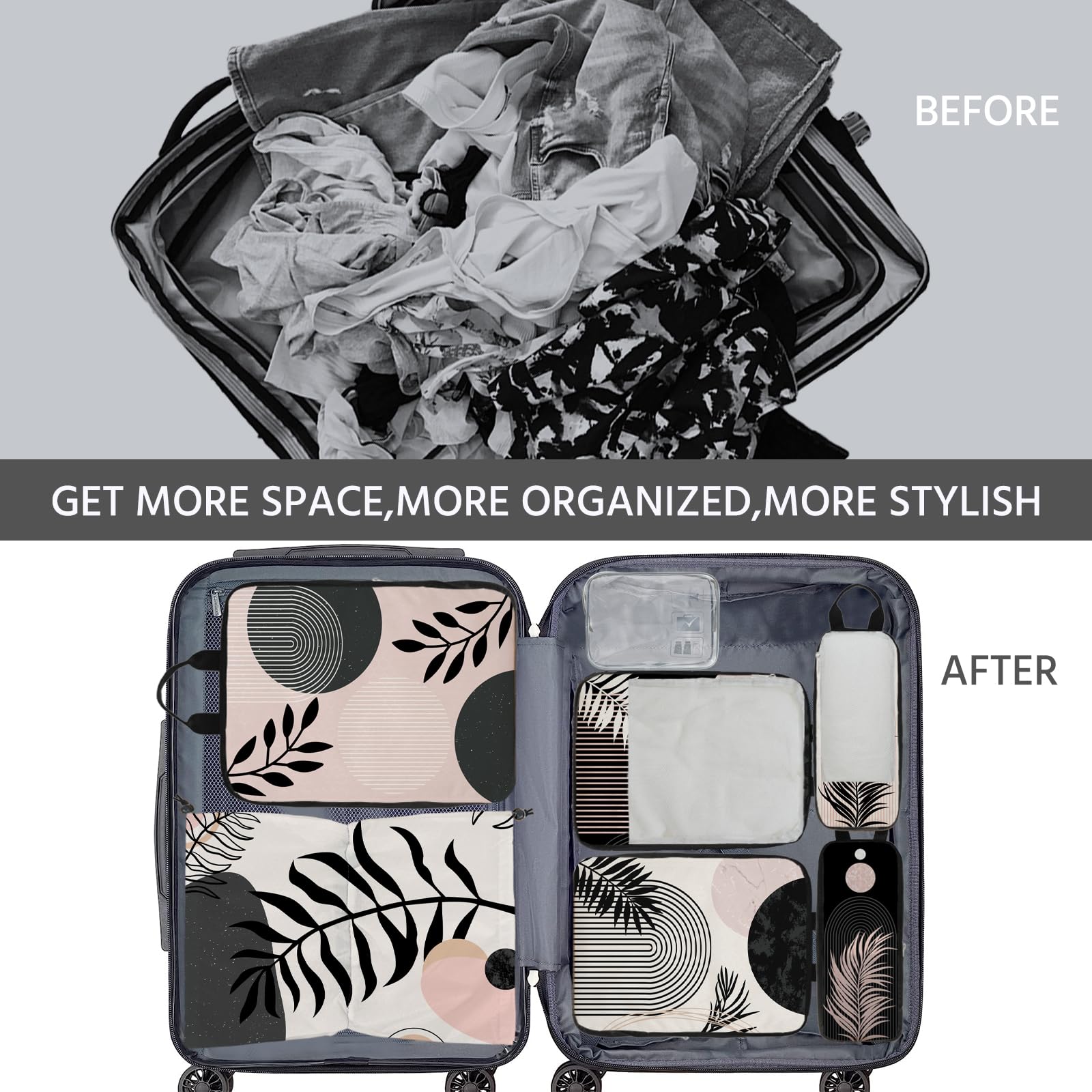7 Pcs Compression Packing Cubes for Travel, Waterproof Suitcase Luggage Backpack Organizer with Toiletry Bag Travel Essentials for Women/Men-Black Bohemia