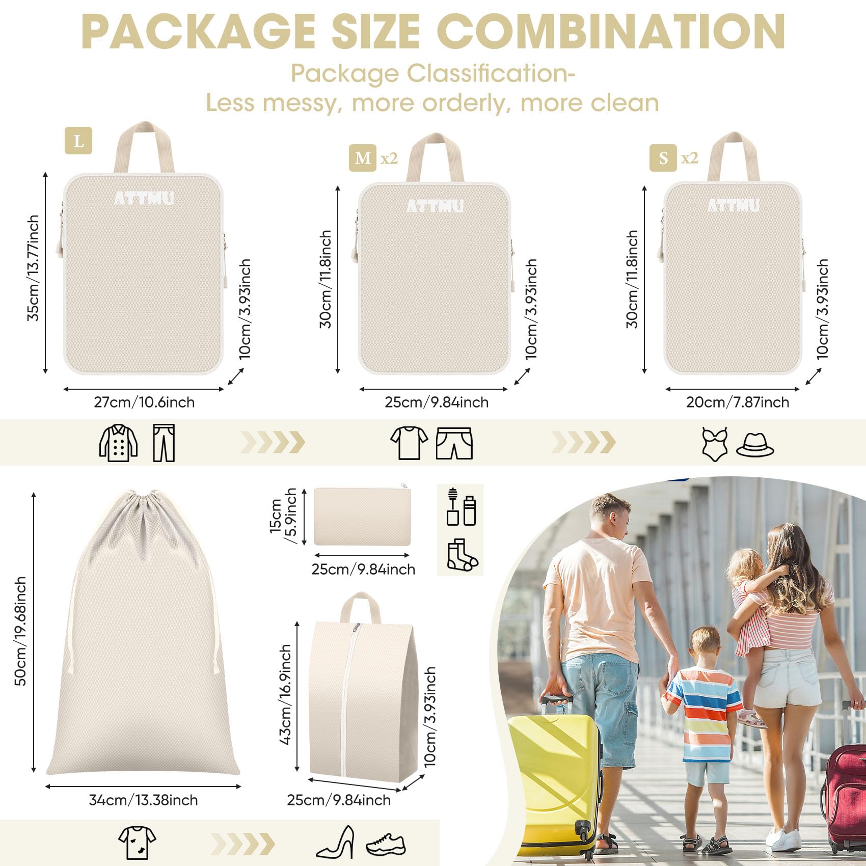- Value Combination: The compression travel cubes contains 1 L(10.6*3.93*13.77inch), 2 M(9.84*3.93*11.8inch), 2 S(7.87*3.93*11.8inch), as well as a shoe bag(9.84*3.93*16.9inch), a drawstring bag(13.38*19.68inch), a flat pocket(9.84*5.9inch), storage bags of various sizes can be used to pack clothes, pants, socks, shoes, cosmetics, etc., say goodbye to messy luggage and wardrobes, and keep your clothes neat and tidy