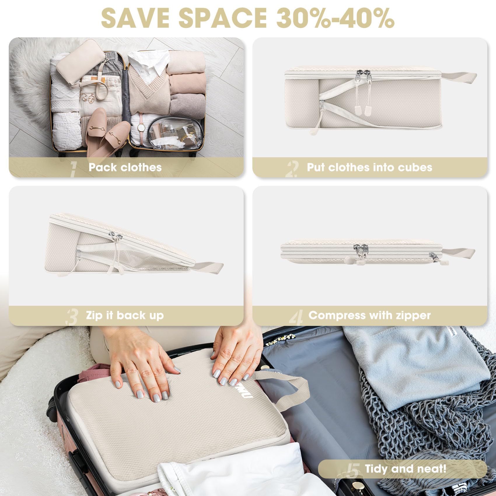 - Space-Saving Design: The 8-pack compression packing cubes has a compression zipper in the middle. When you put the clothes in, then pack them and zip up, the clothes can be compressed into a compact shape, saving 40% of storage space and storing more clothes