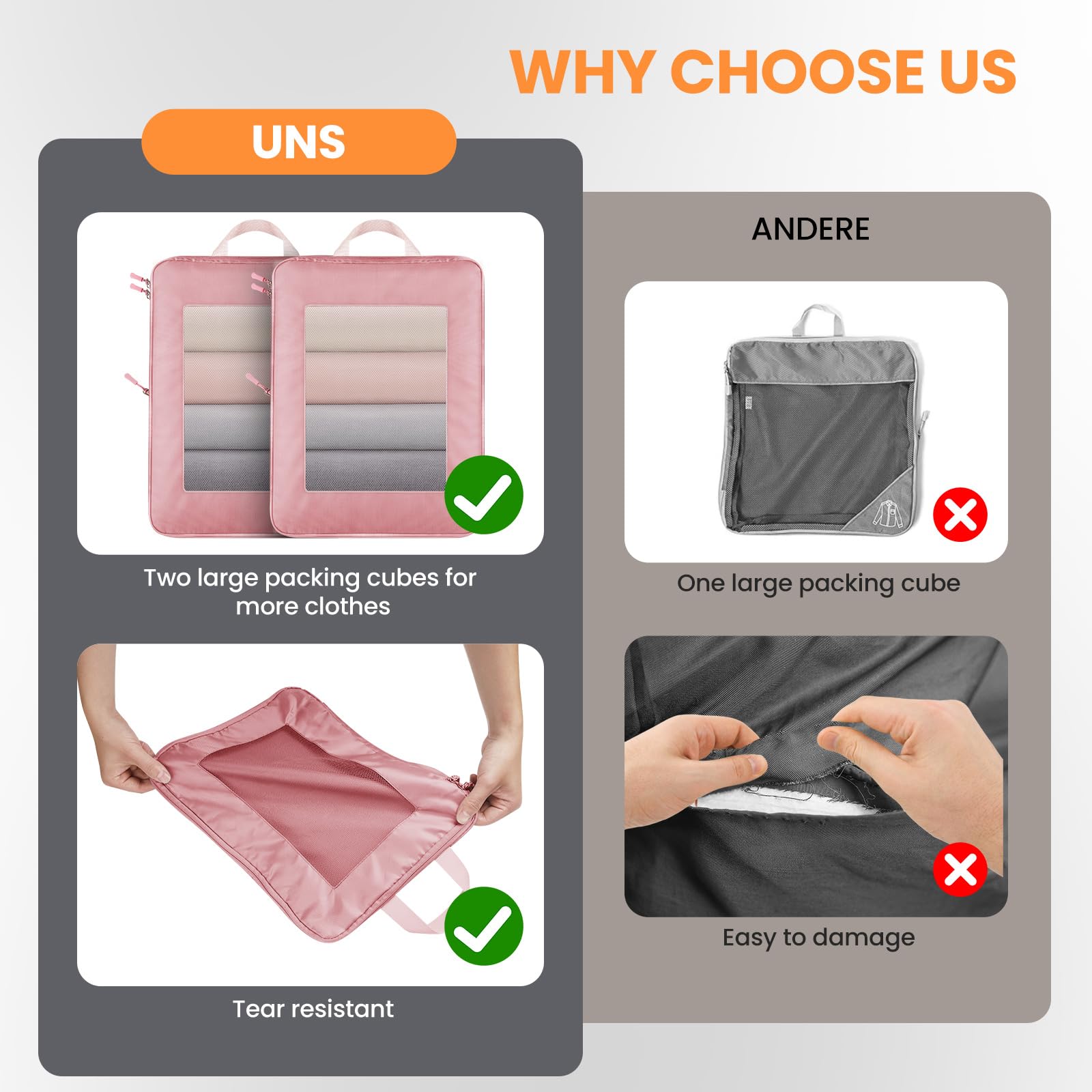 - Save 50% Space & Practical Travel Cubes Size - Thanks to the compression design, you can fit up to twice as many clothes in your suitcase. Compared to other products, our suitcase organizer set comes with two large compression cubes instead of one, which provides more storage space and is perfect for long trips and family travel. However, remember not to over pack as you may not be able to lift your luggage!
