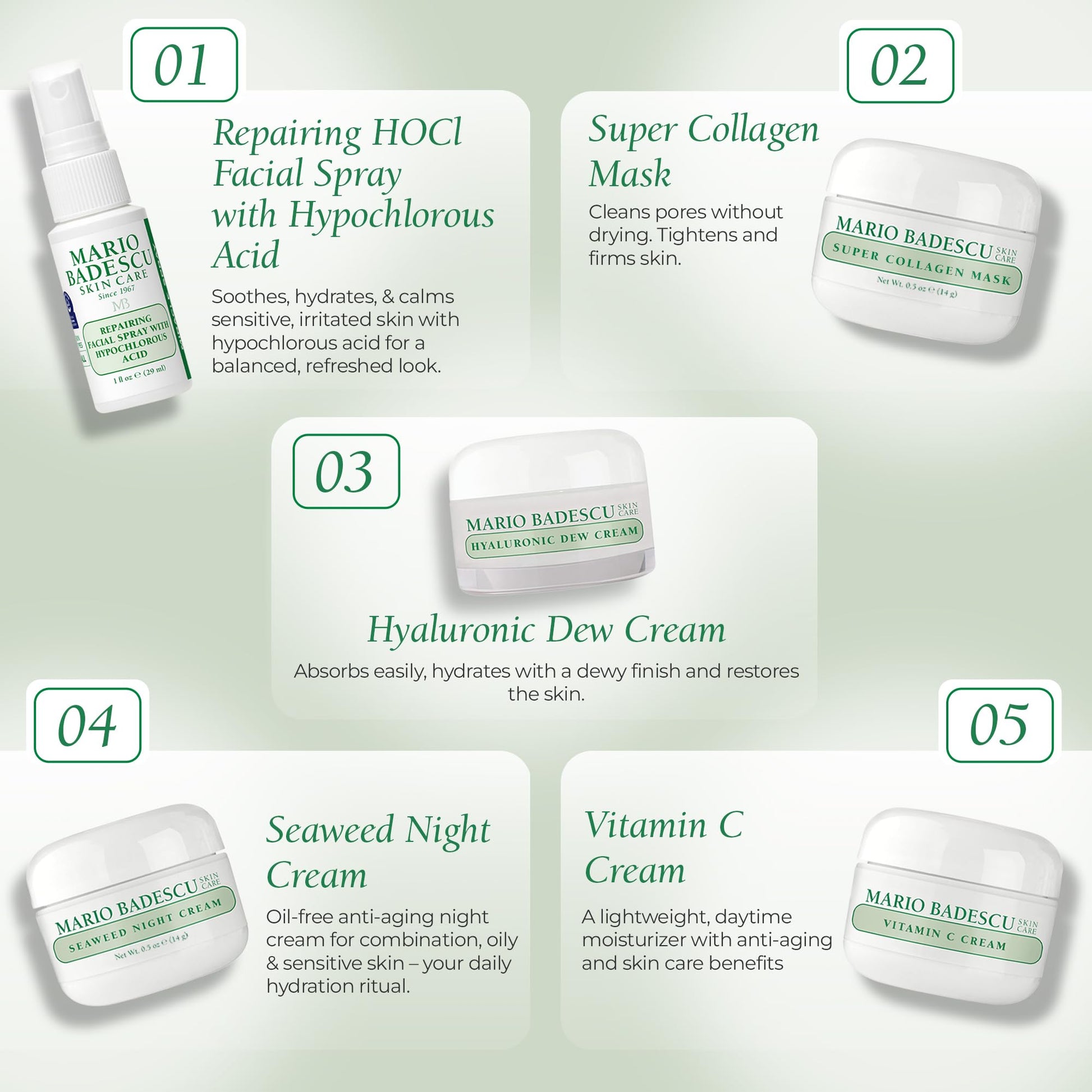 - COMPLETE 10-PIECE SKINCARE KIT - Vitamin C Serum, Glycolic Toner, Hyaluronic Cream, Collagen Mask & HOCI Spray tackle brightening, anti-aging, blemishes & hydration in one travel-ready set.