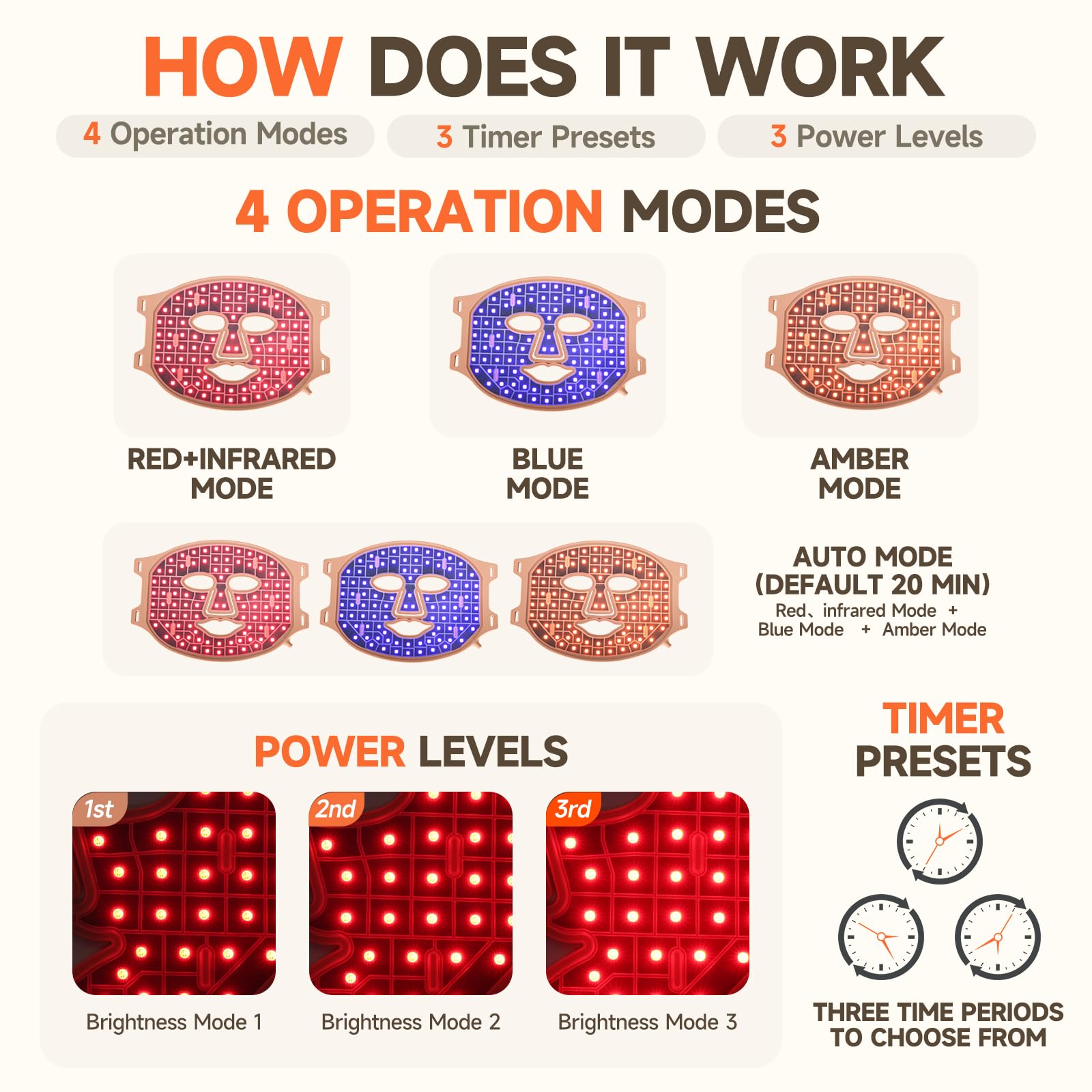 - [Usage Frequency]: Our red light mask is suitable for all skin types. Choose a mode treatment that corresponds to your specific problem to target wrinkles, acne and promote healthy skin. We provide three timer settings and three adjustable brightness levels. Recommended frequency: 3-4 times weekly. The rechargeable remote should be powered up when low. Visible improvements may appear after 4-6 weeks of consistent use (results vary by individual). Important: Never operate while charging.