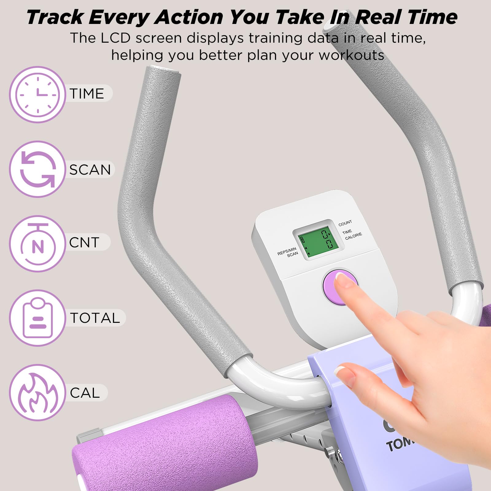- Workout Data Tracking: This ab workout equipment features an LCD display that tracks calories burned, exercise duration, and repetitions, allowing you to monitor each session and create personalized workout plans. You can also press and hold the button to reset your workout records