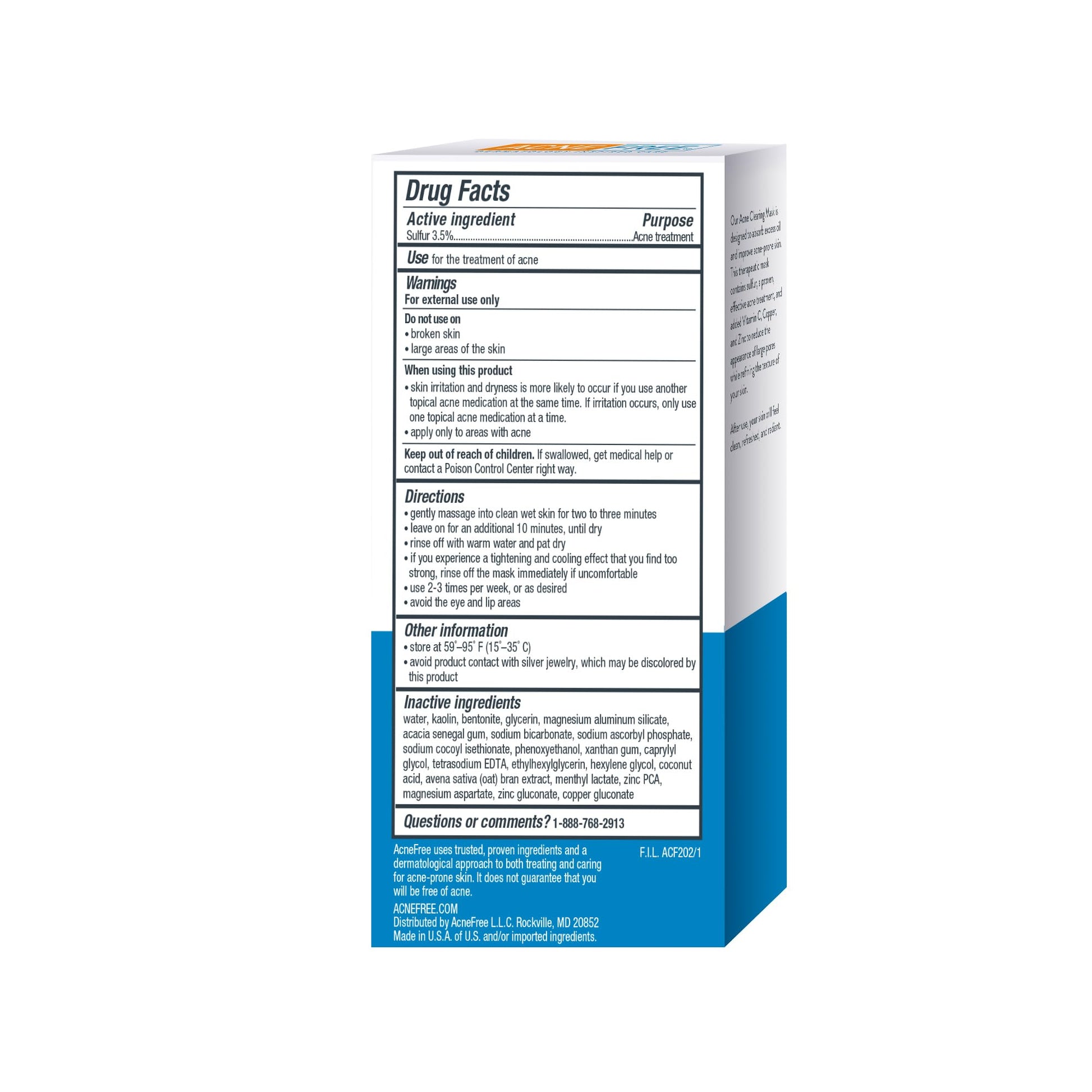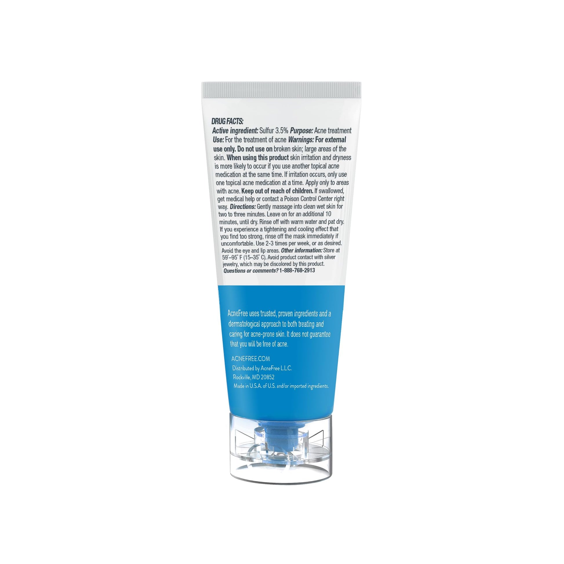 Details: If you experience oily skin with acne, the AcneFree Therapeutic Sulfur Mask is the solution for you. This penetrating pore therapy soothes acne-inflamed skin and absorbs excess oils. This treatment is for acne or acne prone skin and also removes impurities, while redefining skin’s entire essence. You feel a cool facial tingle as the mixture massages your pores and revives your skin’s complexion. The secret is the Revolutionary Color-Signal Technology, which transforms the mask a blue tone once it’s completely absorbed and the treatment is complete. The process is easy and convenient to use, and helps to clear blackheads and whiteheads, as well as acne blemishes.AcneFree Product Details: Dimensions: 1.2 x 2.8 x 5.1 inches Weight: 2.72 ounces Supply: 60 days Acne Treatment Type: Face Mask For: Mild to Moderate Acne.