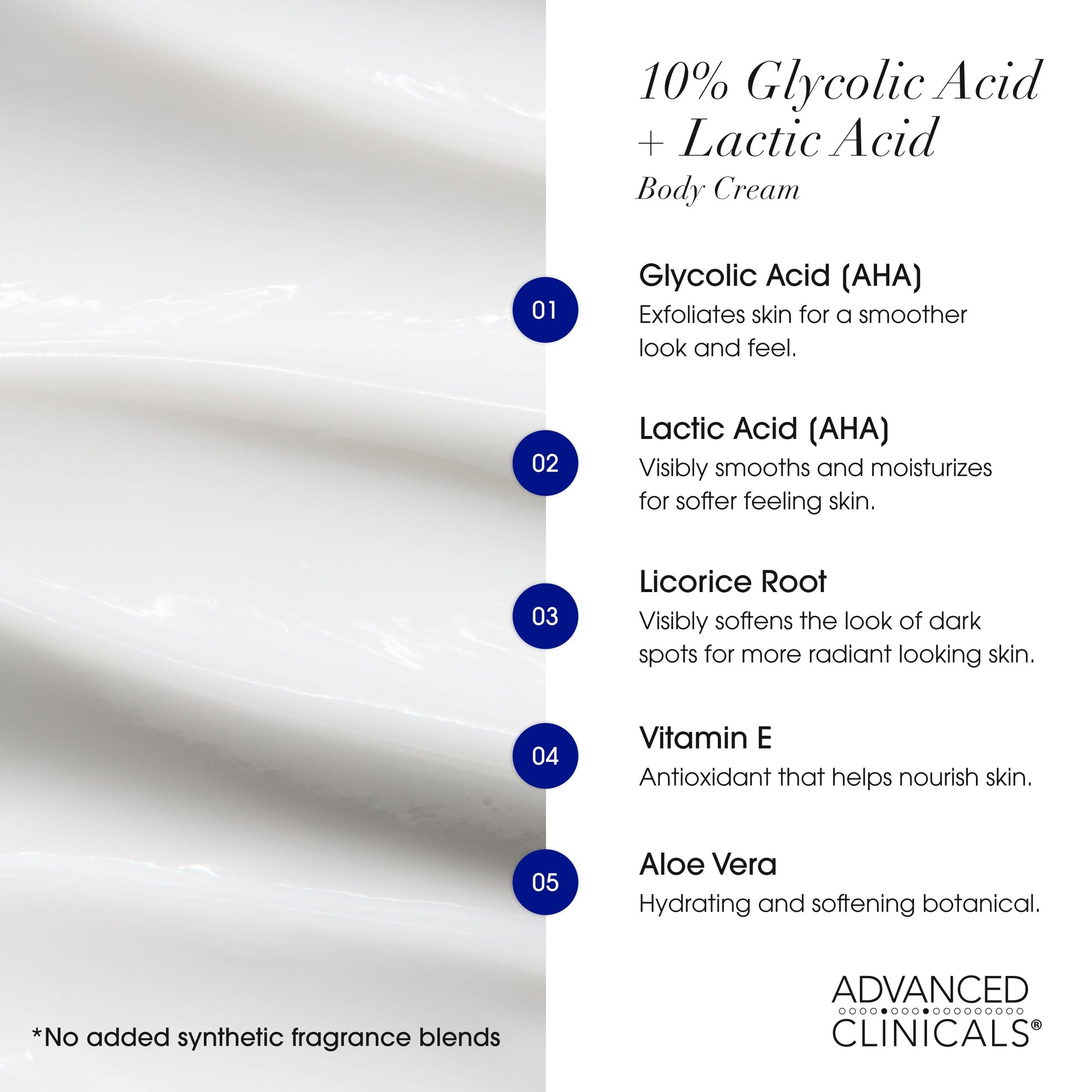 - 10% GLYCOLIC ACID + LACTIC ACID CREAM SMOOTHS ROUGH, DRY SKIN & PROMOTES EVEN LOOKING SKIN – This Glycolic Acid + Lactic Acid lotion exfoliating body cream exfoliates to reveal softer, more radiant skin. The advanced formula hydrates while improving the look of skin texture, reducing the appearance of rough and dry skin. Formulated by cosmetic chemists, for women and men looking to visibly exfoliate rough looking skin for enhanced skin softness.