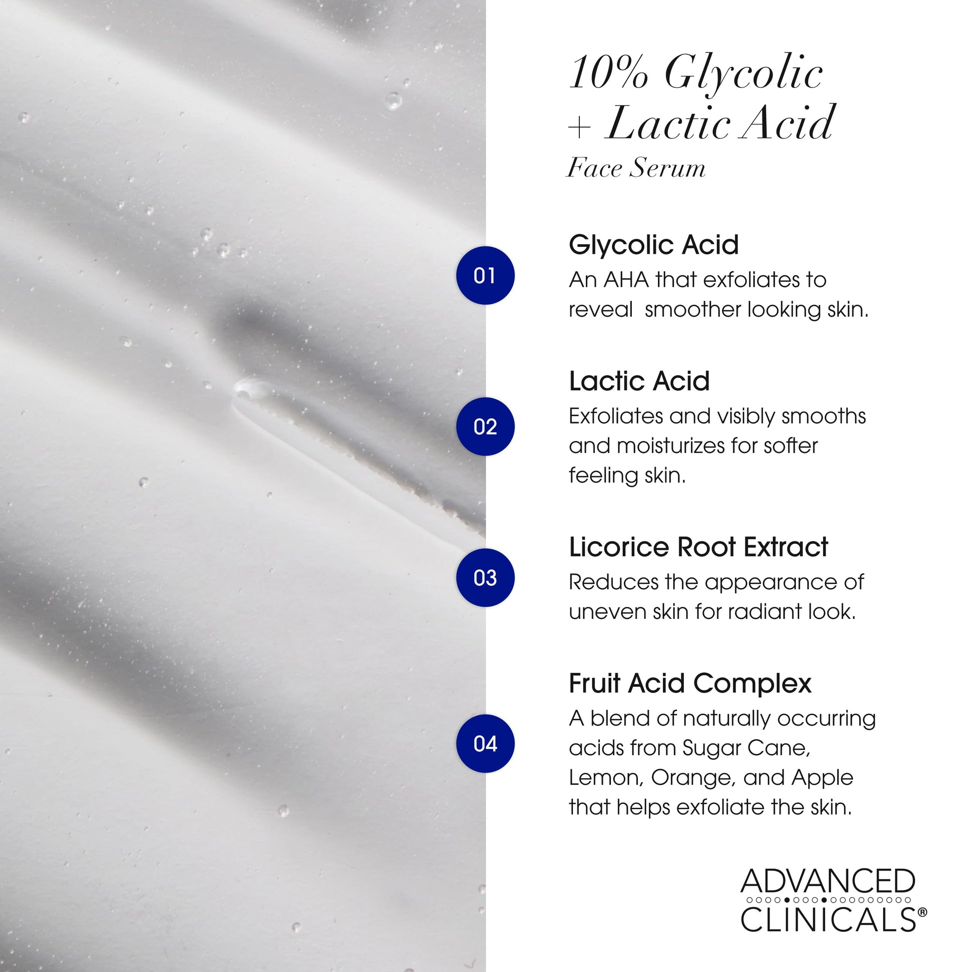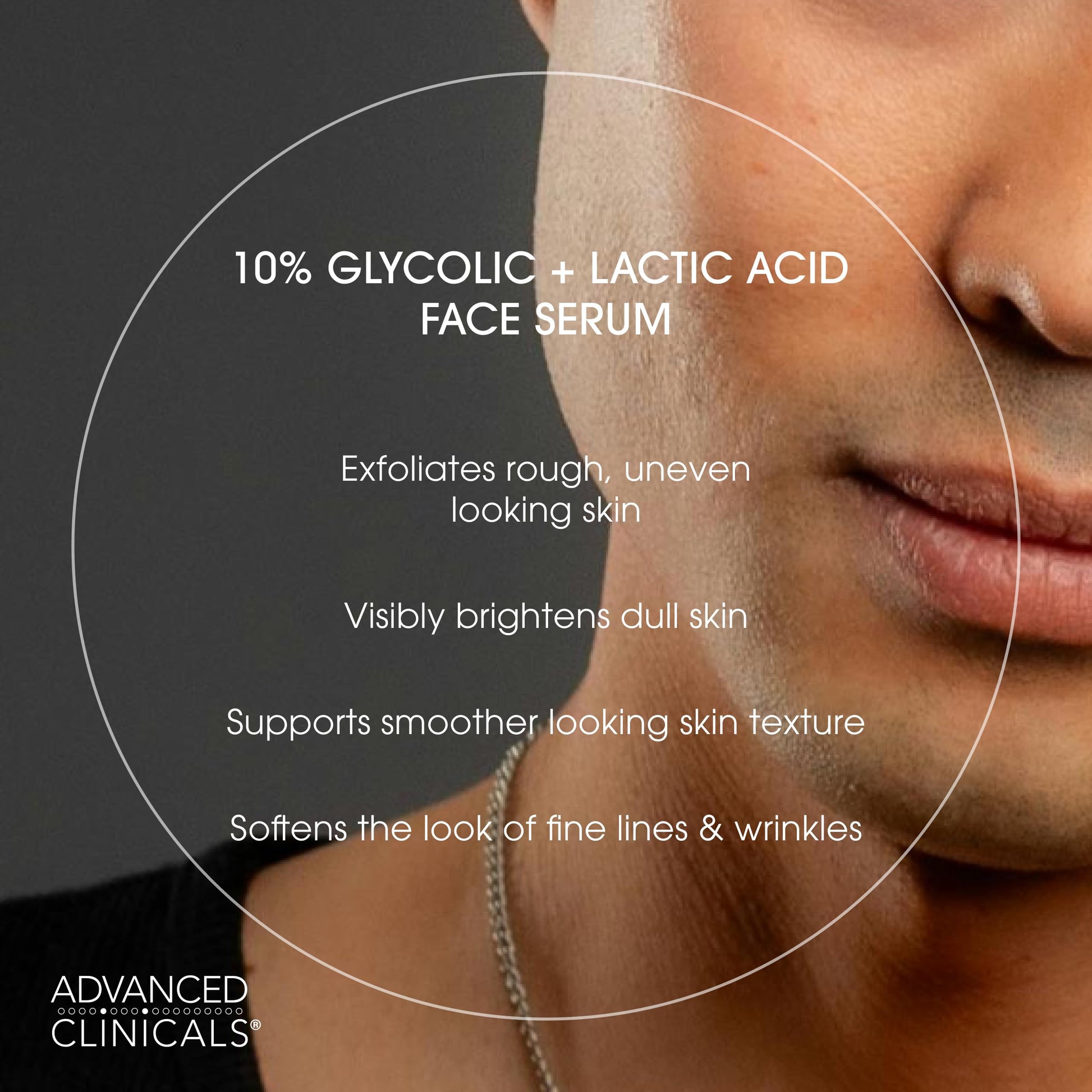 Advanced Clinicals 10% Glycolic Acid + Lactic Acid Body Lotion Moisturizer + AHA Glycolic Acid Face Serum 2pc Exfoliating Skincare Set To Reduce Look Of Uneven Rough Skin Texture, Fragrance Free, 2pc