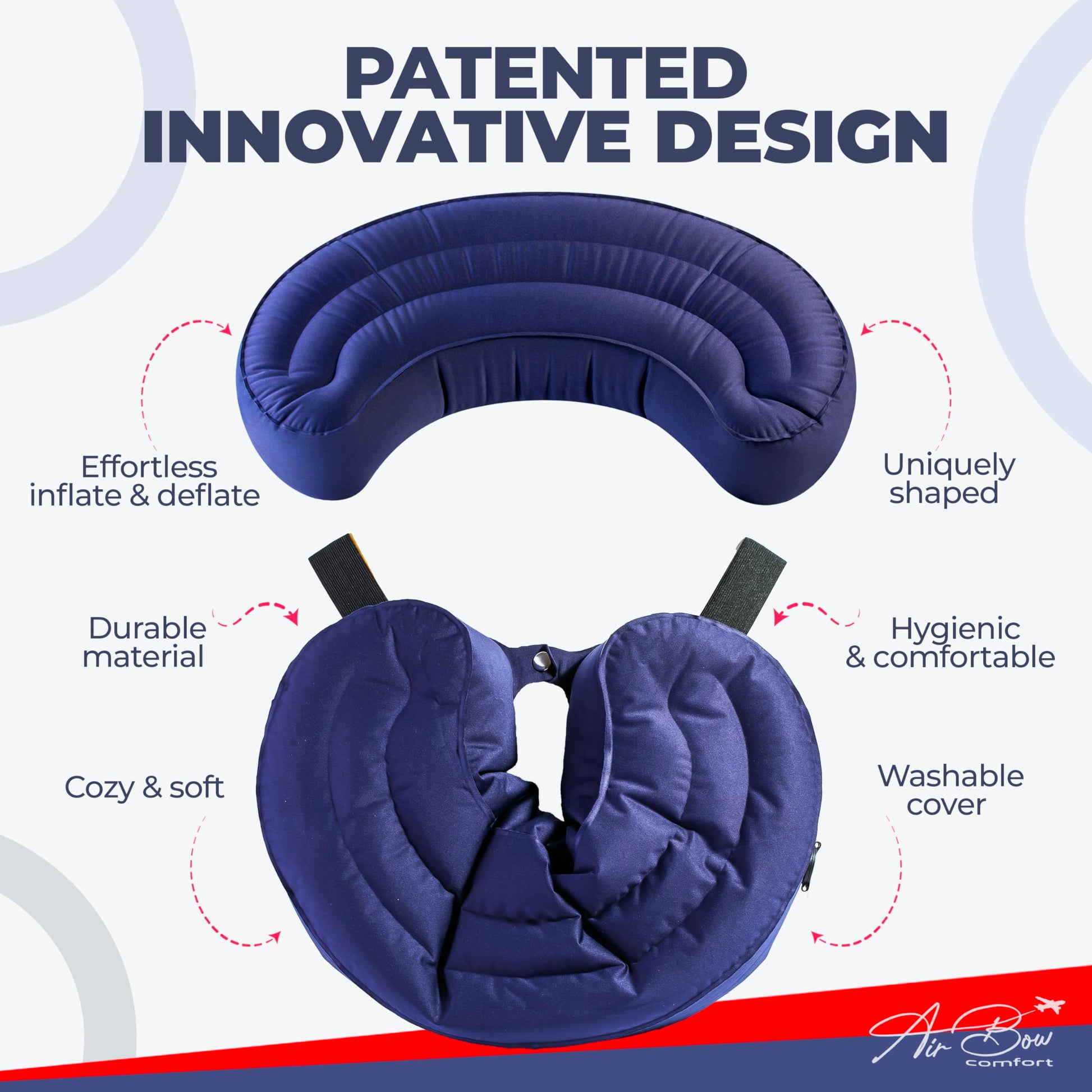 Air Bow Comfortable Travel Pillow - Airplane Pillow for Head, Neck, & Chin Rest, Inflatable & Soft Neck Pillow - Durable Material with Hygienic & Washable Cover, Easy to Inflate & Deflate (Blue)