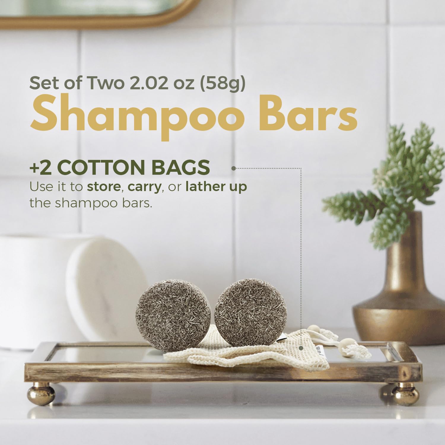 - PACK OF TWO - Equivalent to 3 shampoo bottles, this set of two 2.02oz natural shampoo bars offer months-worth of salon-quality care. Comes with 2 cotton bags that are ideal as shampoo bar storage & can be used to carry or lather up the bars.