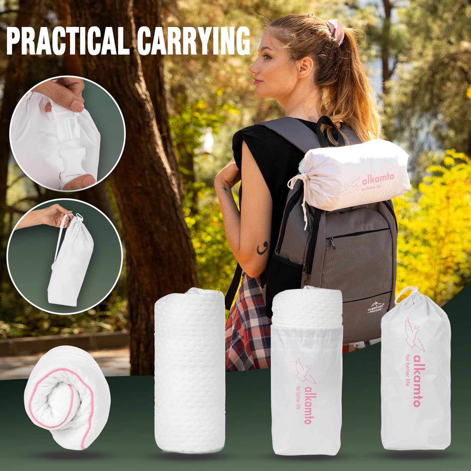 alkamto Travel & Camping Comfortable Memory Foam Pillow – Easy to Carry Portable Bag – Temperature Regulating Pillow Case (Pink + Extra Cover)