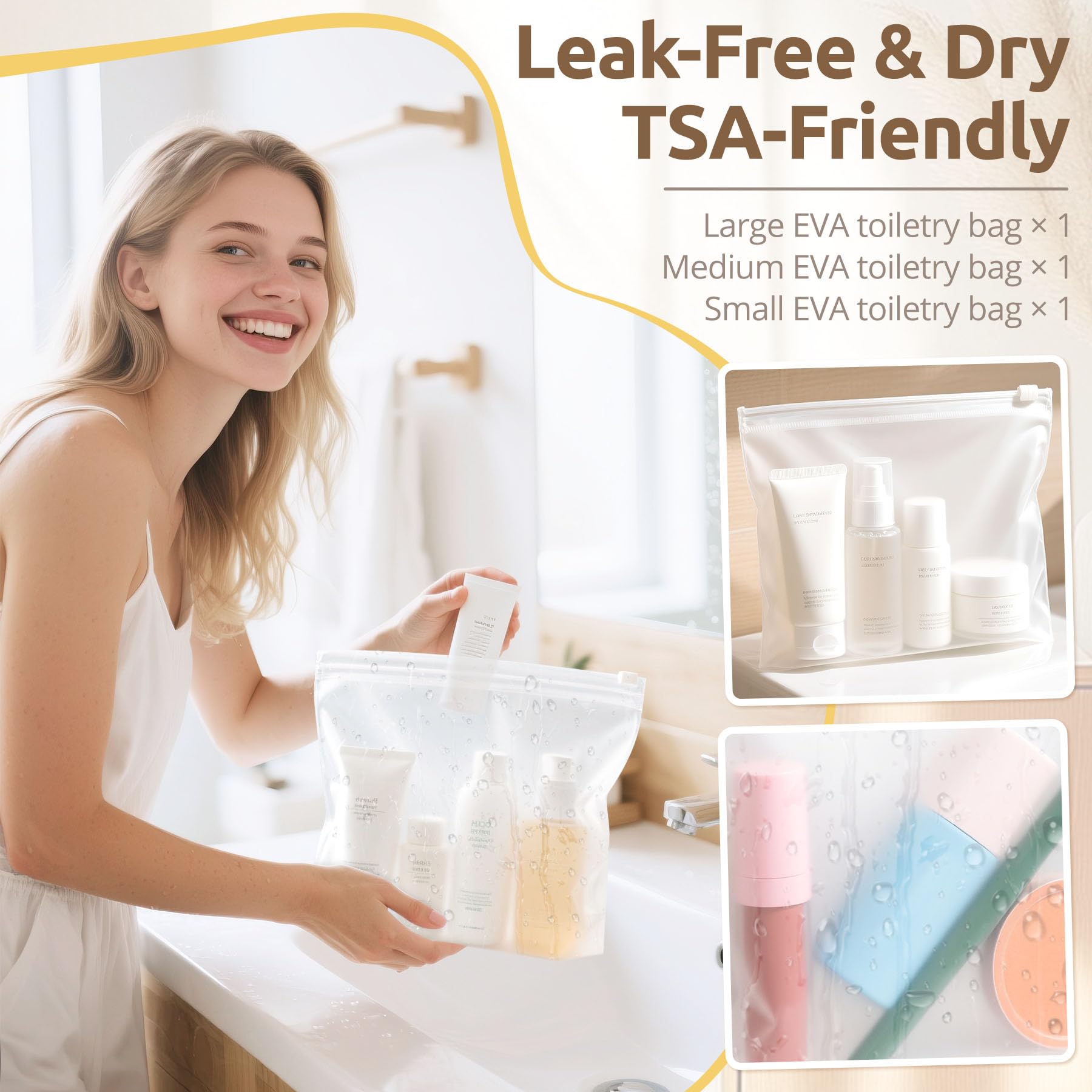 - Toiletries, sorted and spill-proof: Tiny hotel sinks? Crowded airport stalls? No stress. Clear waterproof bags keep skincare, jewelry, and toothbrushes clean, visible, and leak-free