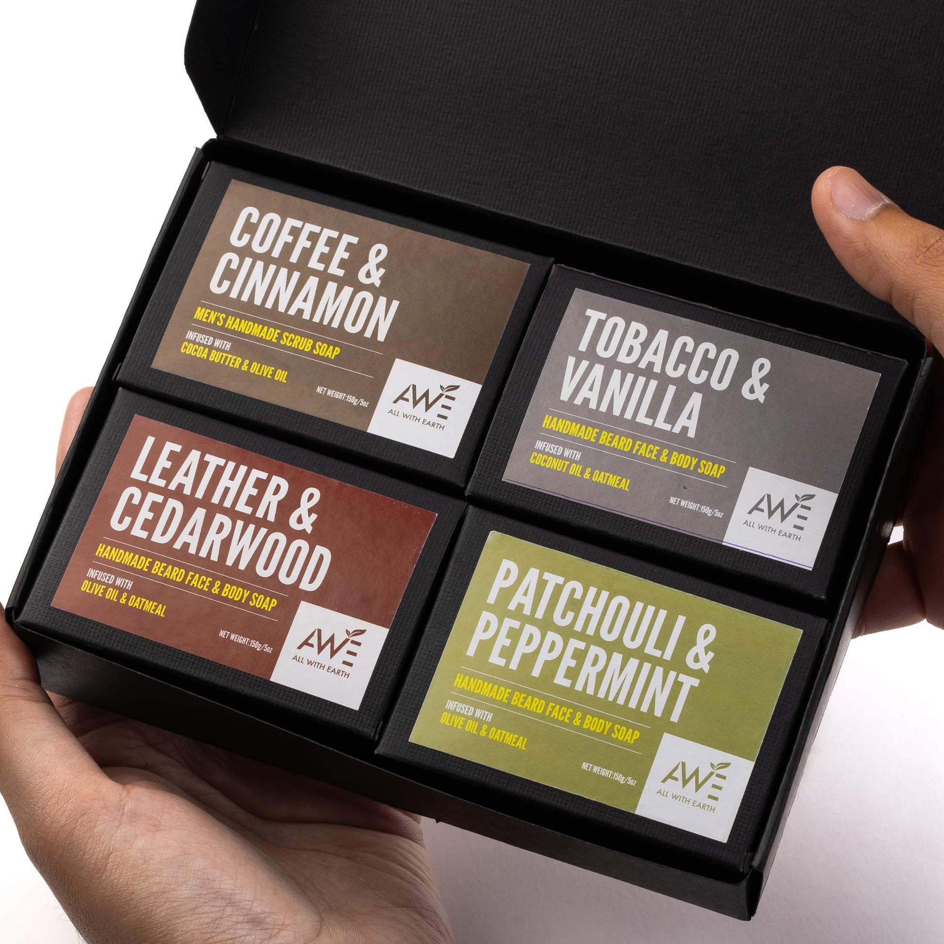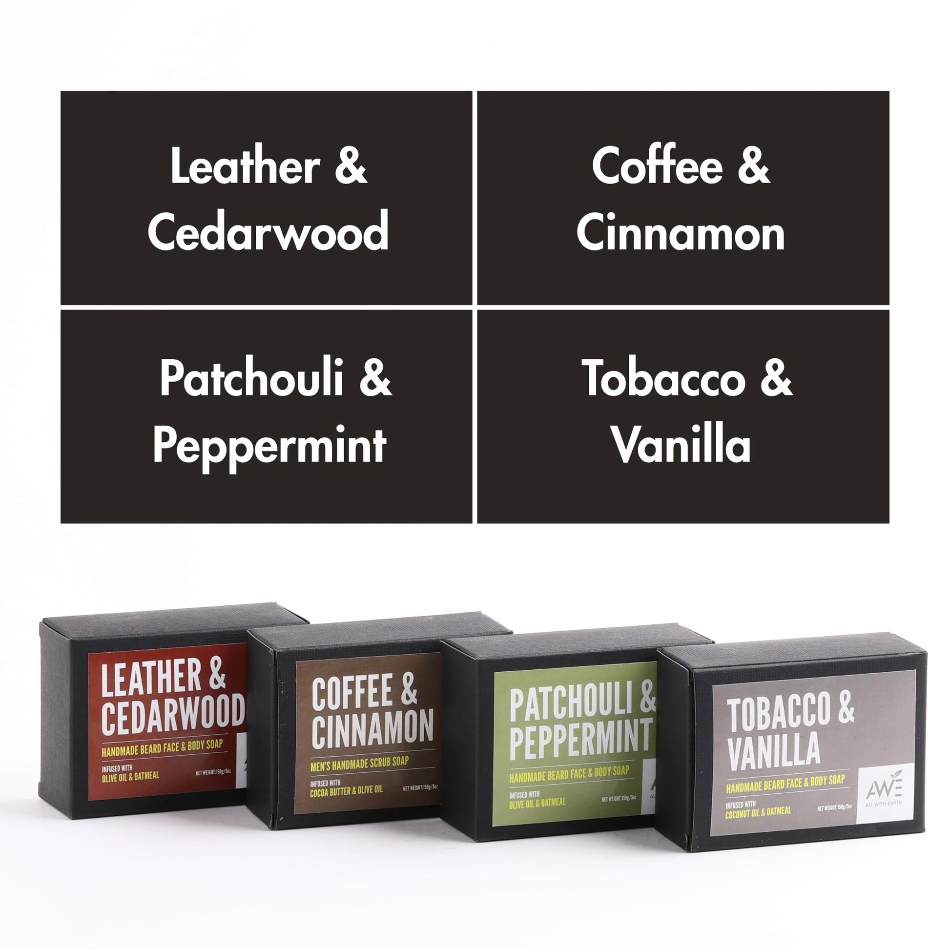 - 4 Rugged Handmade Soaps in One Set – Includes Leather & Cedarwood, Coffee & Cinnamon, Patchouli & Peppermint, and Tobacco & Vanilla. Bold, masculine scents designed to cleanse, hydrate, and refresh.