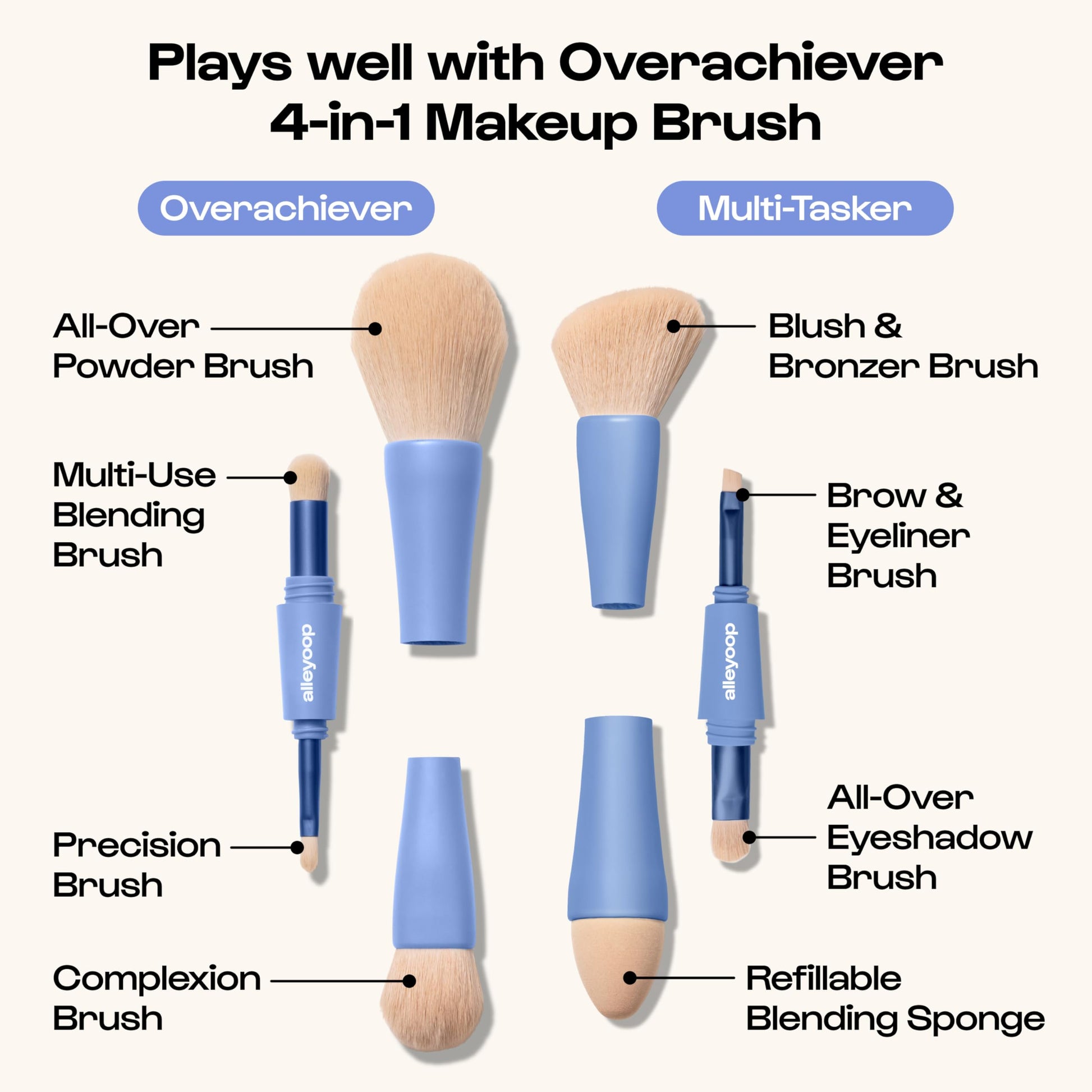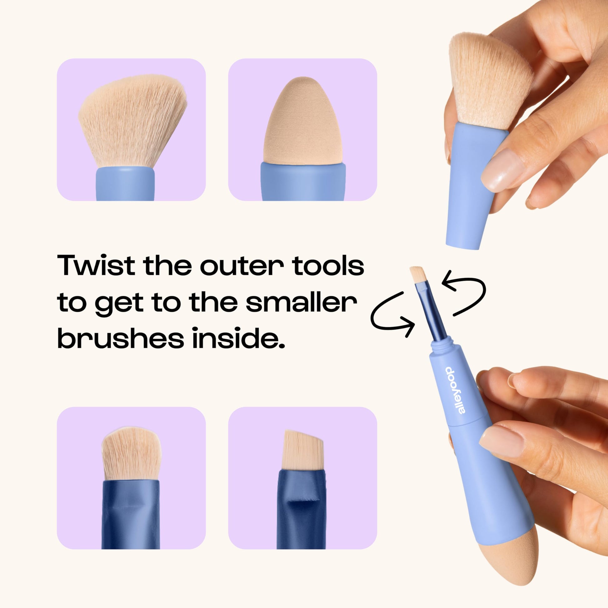 Alleyoop Multi-Tasker 4-in-1 Travel Makeup Brush Set – Compact Makeup Brushes with Blending Sponge, Eyeshadow, Eyebrow & Liner, Blush & Bronzer Brush – Mini Makeup Tools Kit for Women, Vegan